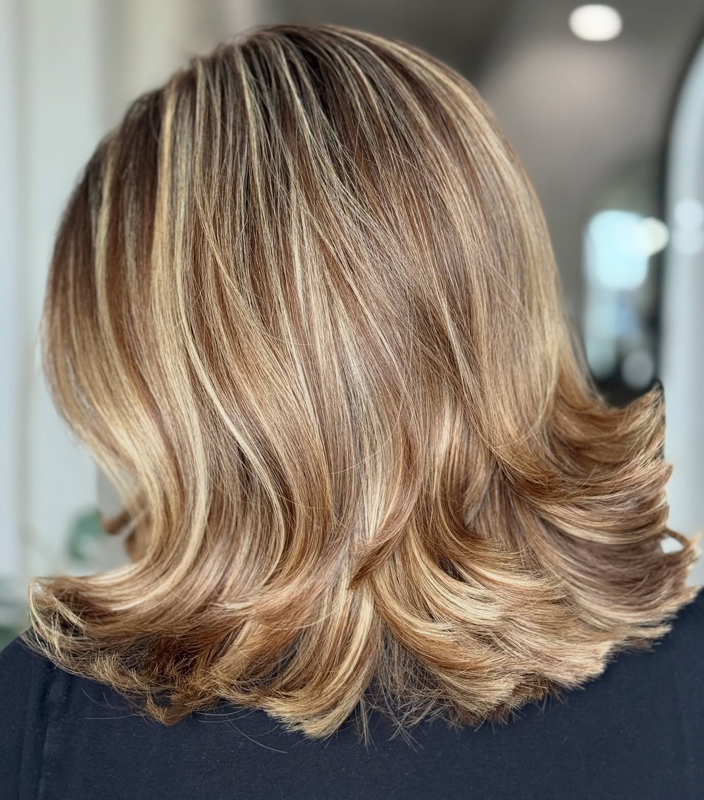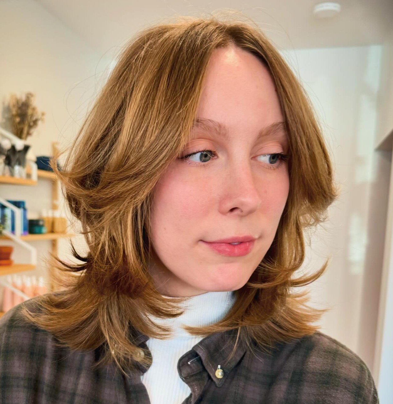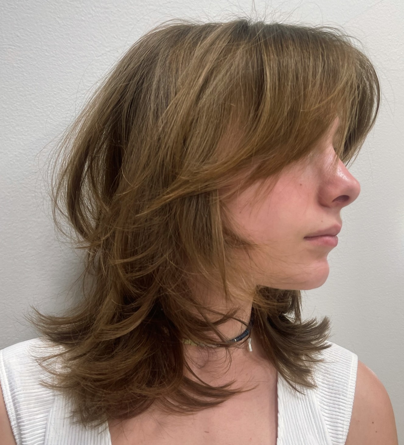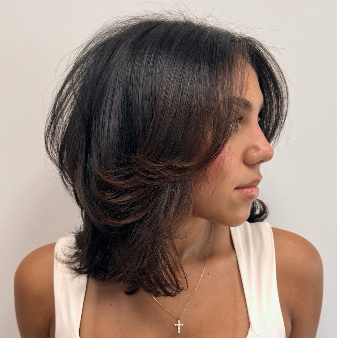 If you’re a volume junky, a deep side part will be your best friend. A light curl and lifting spray will help you achieve this glam style. The chunky layers help balance the boost for a full shape all the way around.