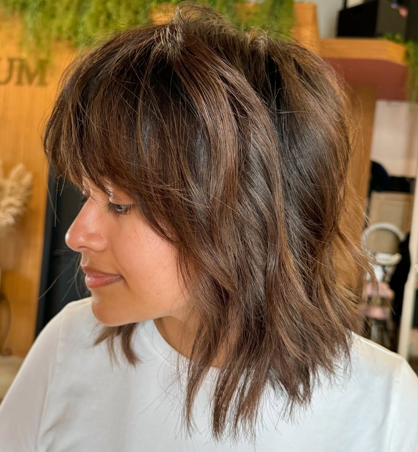 Choppy layers instantly create visual interest and are a great addition to your cut. Go no shorter than shoulder length and finish with loose curls to keep the style from appearing dated or flat.