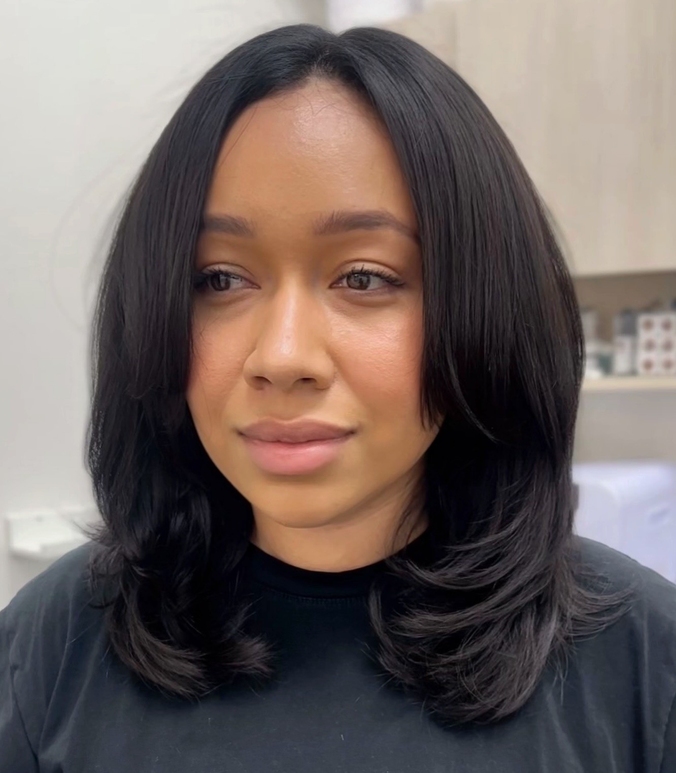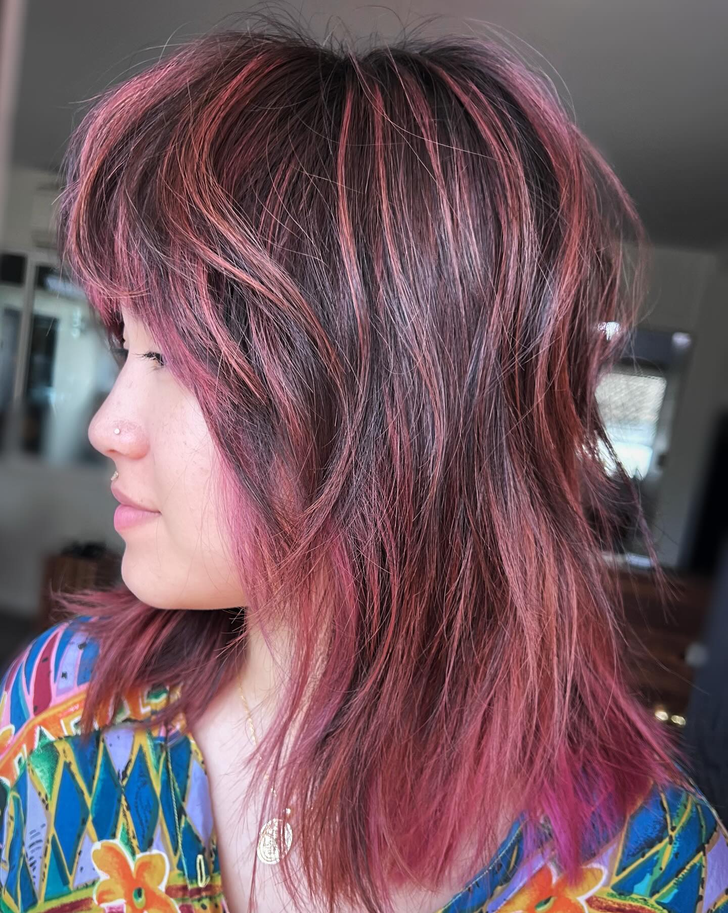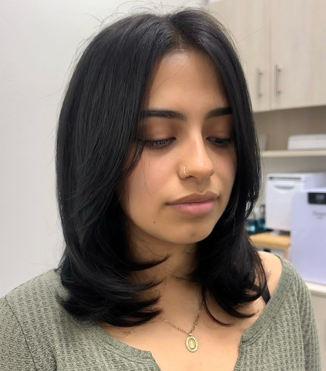 A shade as beautiful as this deserves the same aspiring hairstyle! The layers and curtain bangs are a proven recipe for a more voluminous and fuller hairstyle. Leave your ends blunt to bring edgy vibes to this look.