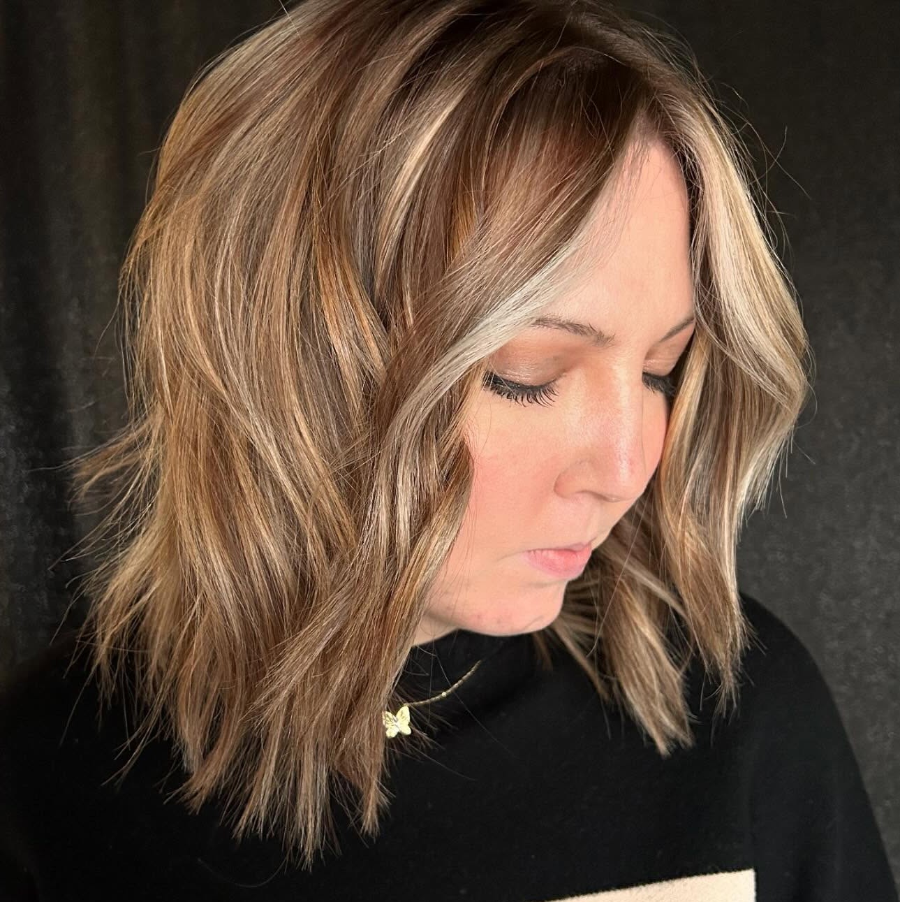 Shaggy lob with wispy bangs is very universal as it suits any face shape and hair texture. With blonde balayage and textured layers, you will get a playful hairstyle that will flatter your lovely appearance. Pro tip: use a texturizing spray to give your hair a tousled look.