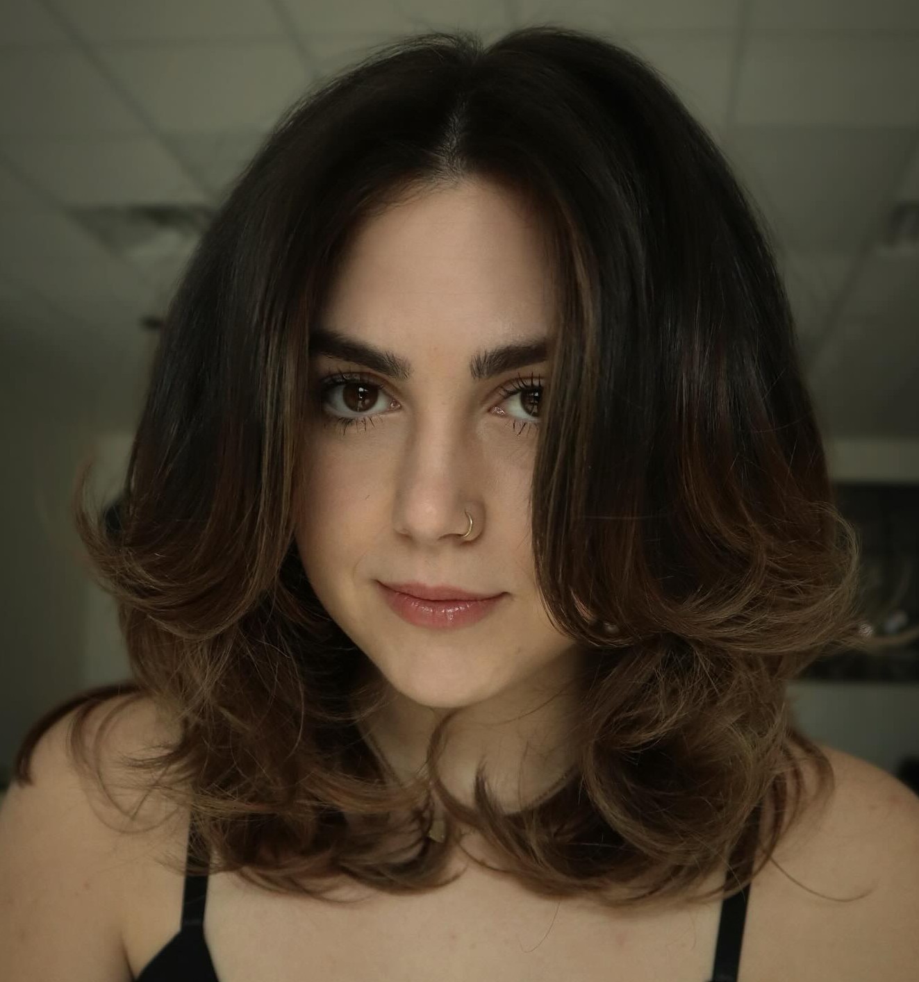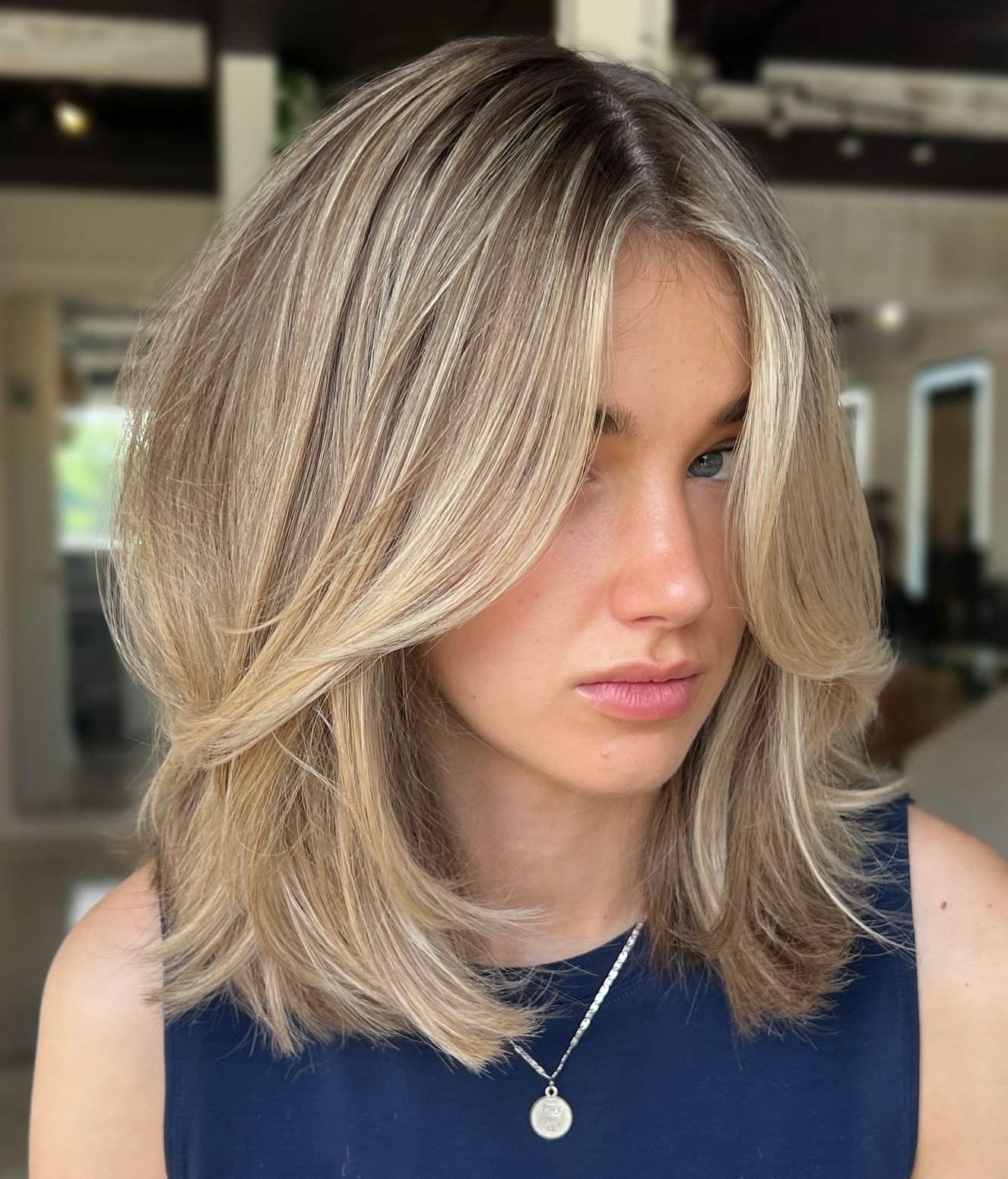 Shaggy lob with wispy bangs is very universal as it suits any face shape and hair texture. With blonde balayage and textured layers, you will get a playful hairstyle that will flatter your lovely appearance. Pro tip: use a texturizing spray to give your hair a tousled look.