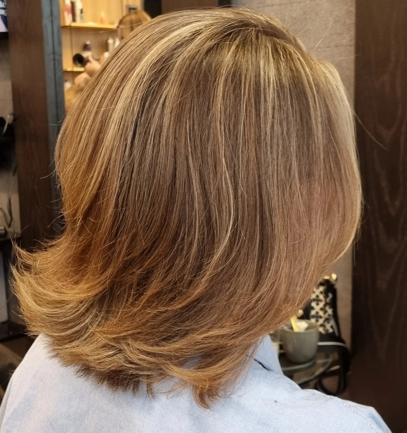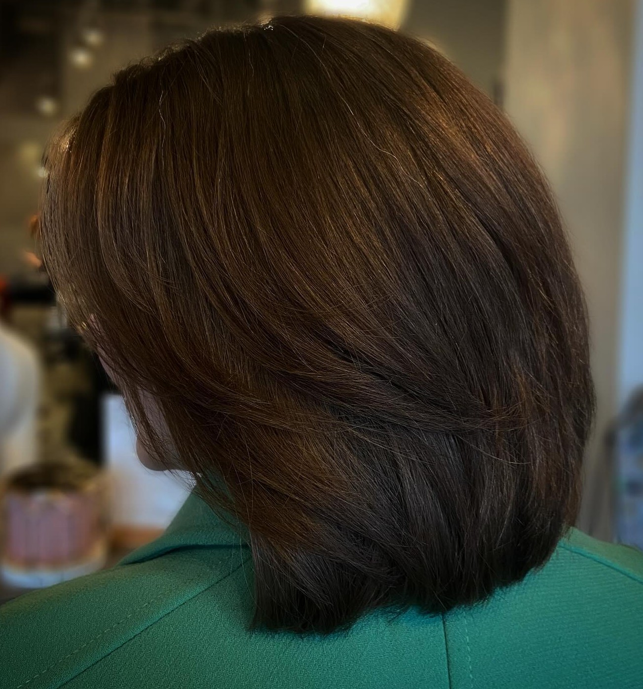 If you’re a volume junky, a deep side part will be your best friend. A light curl and lifting spray will help you achieve this glam style. The chunky layers help balance the boost for a full shape all the way around.