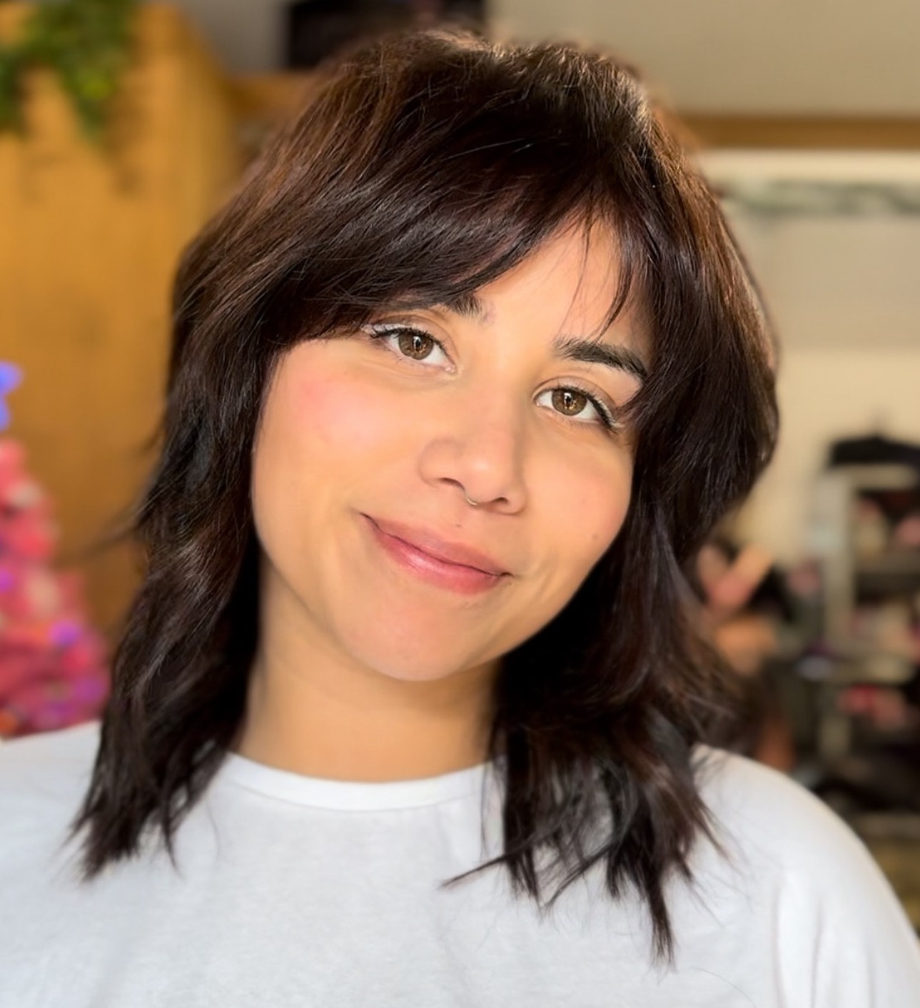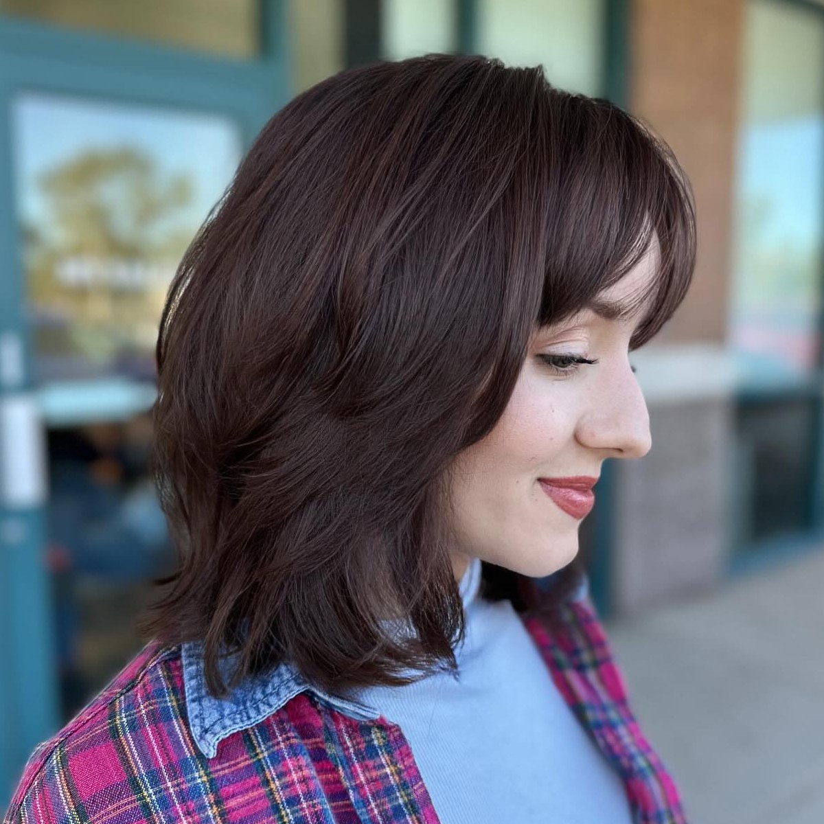 If you’re a volume junky, a deep side part will be your best friend. A light curl and lifting spray will help you achieve this glam style. The chunky layers help balance the boost for a full shape all the way around.