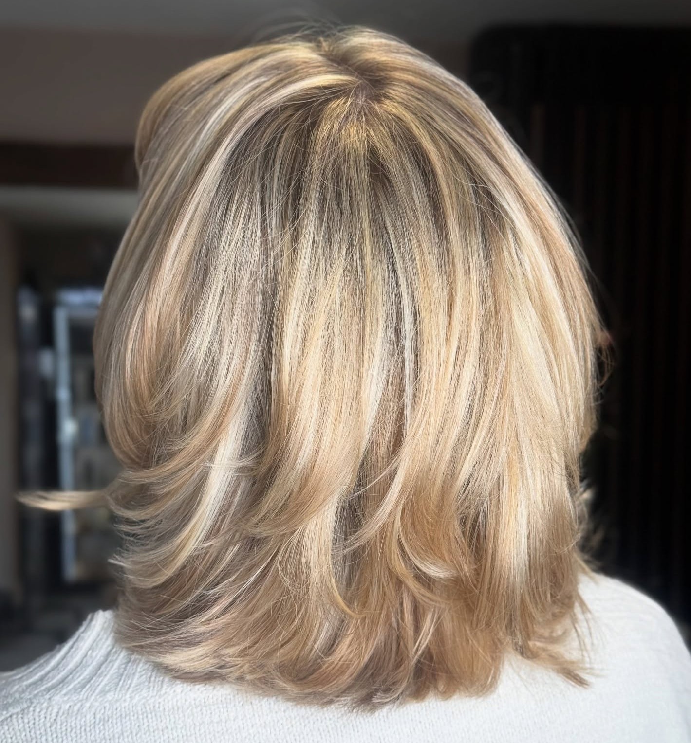 If you’re a volume junky, a deep side part will be your best friend. A light curl and lifting spray will help you achieve this glam style. The chunky layers help balance the boost for a full shape all the way around.