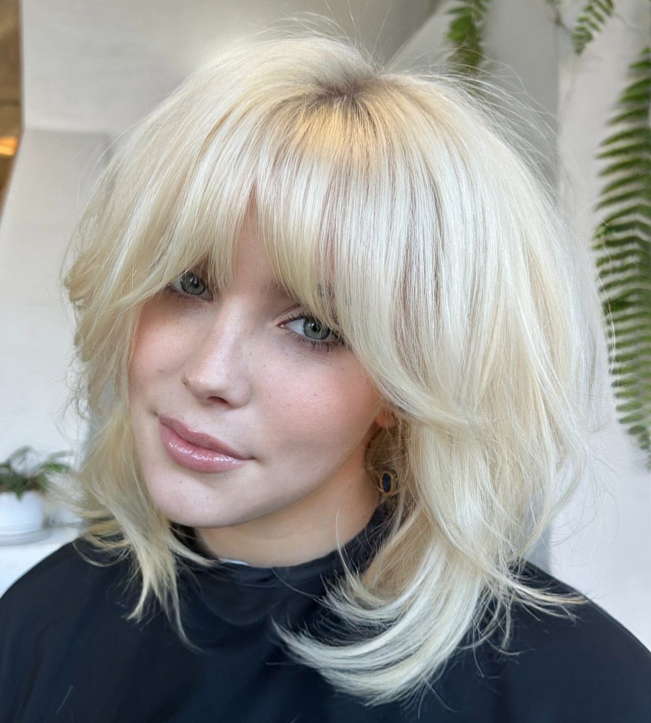 Shaggy lob with wispy bangs is very universal as it suits any face shape and hair texture. With blonde balayage and textured layers, you will get a playful hairstyle that will flatter your lovely appearance. Pro tip: use a texturizing spray to give your hair a tousled look.