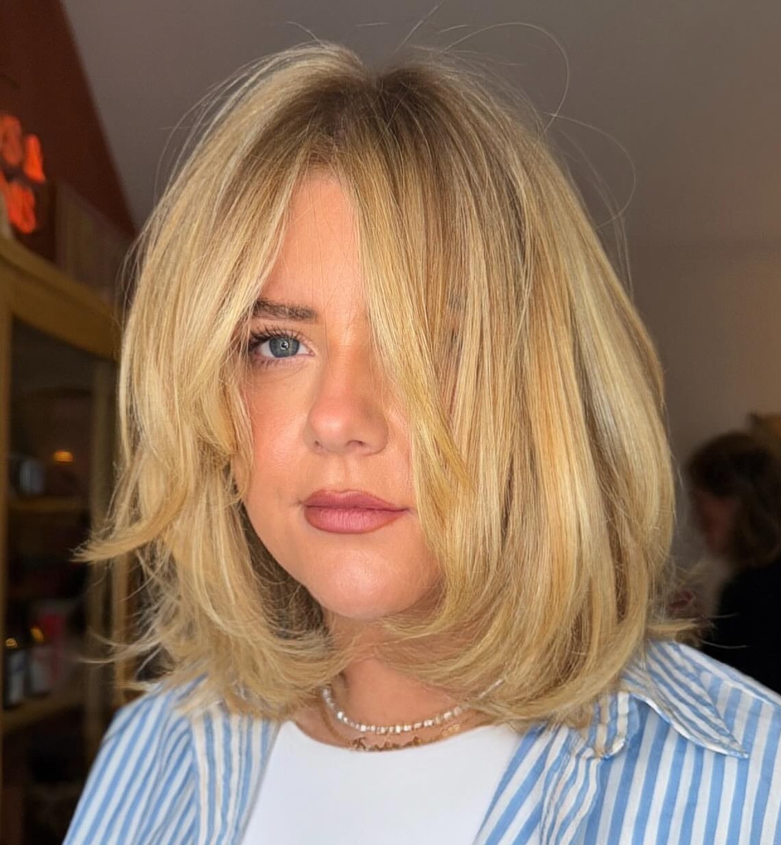Shaggy lob with wispy bangs is very universal as it suits any face shape and hair texture. With blonde balayage and textured layers, you will get a playful hairstyle that will flatter your lovely appearance. Pro tip: use a texturizing spray to give your hair a tousled look.