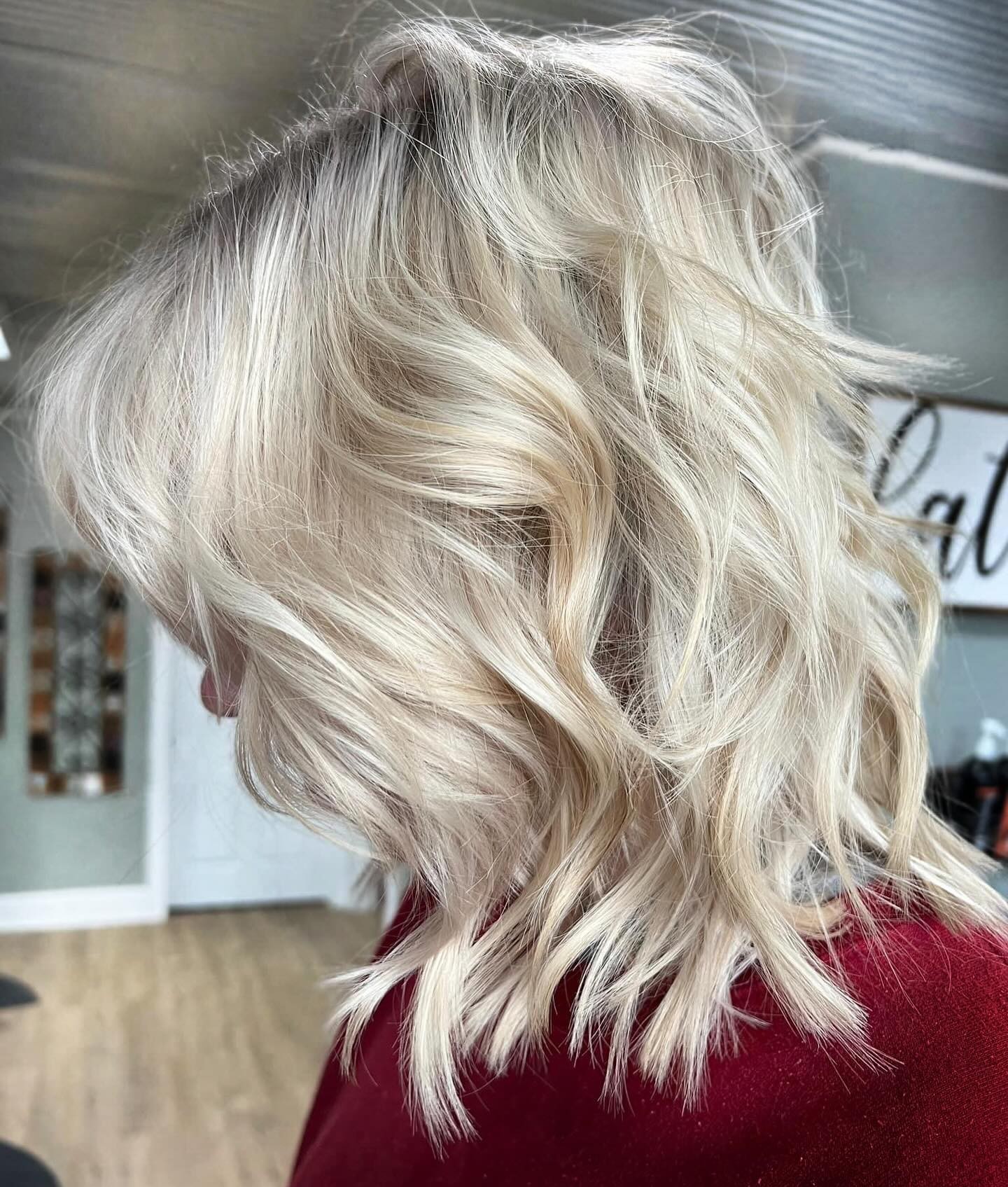 If you’re a volume junky, a deep side part will be your best friend. A light curl and lifting spray will help you achieve this glam style. The chunky layers help balance the boost for a full shape all the way around.