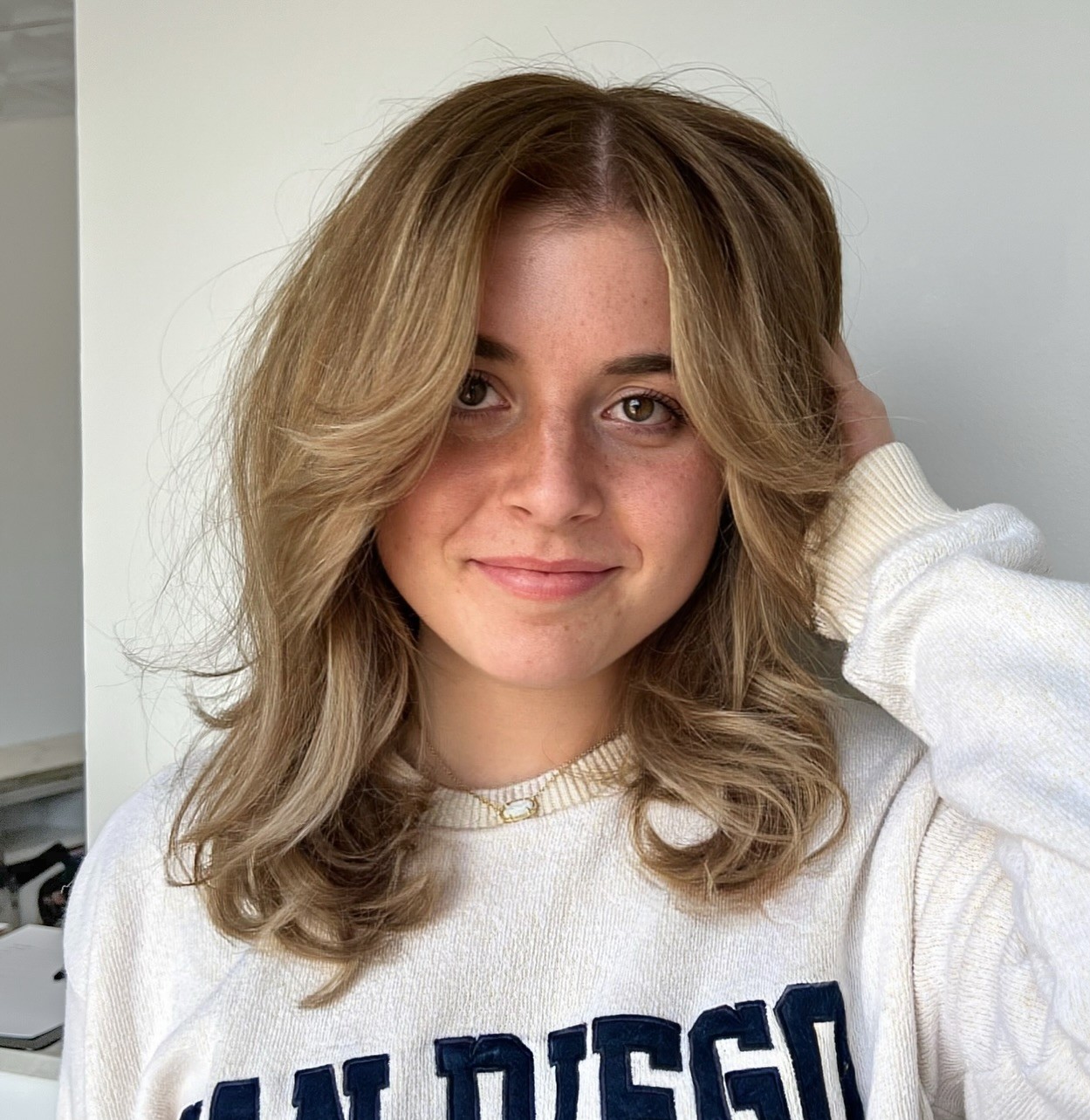 There’s something charming about texturizing hairstyles like this one, especially if they are complemented with trendy face-framing highlights. To create this beautiful natural wave texture, let your hairstylist add internal layers all over your head.