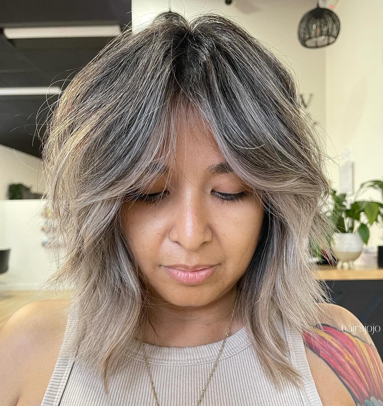 Shaggy lob with wispy bangs is very universal as it suits any face shape and hair texture. With blonde balayage and textured layers, you will get a playful hairstyle that will flatter your lovely appearance. Pro tip: use a texturizing spray to give your hair a tousled look.