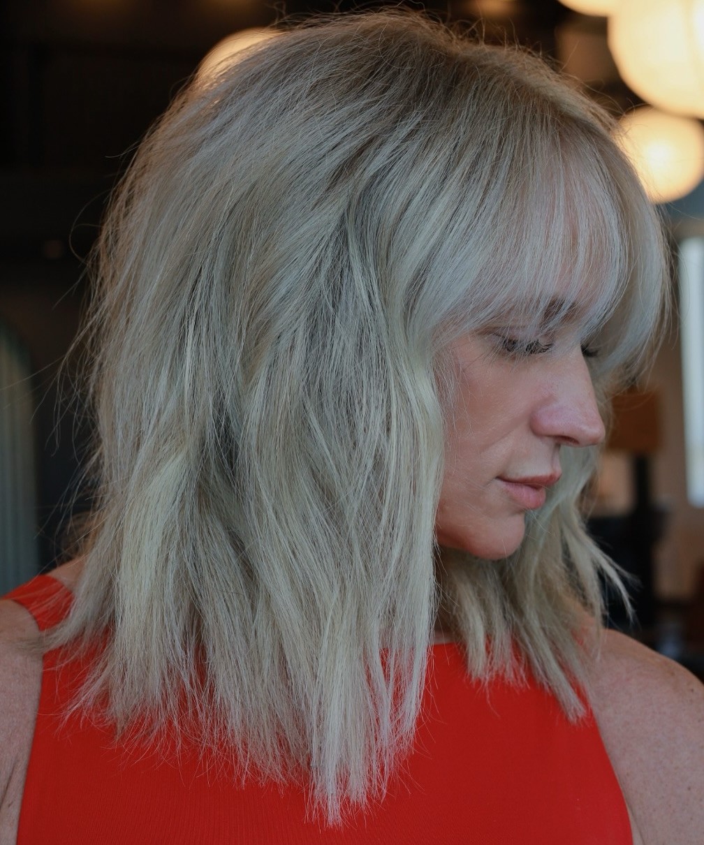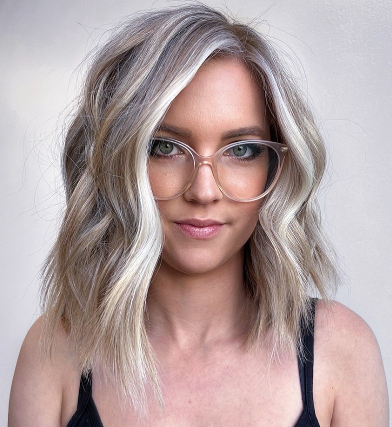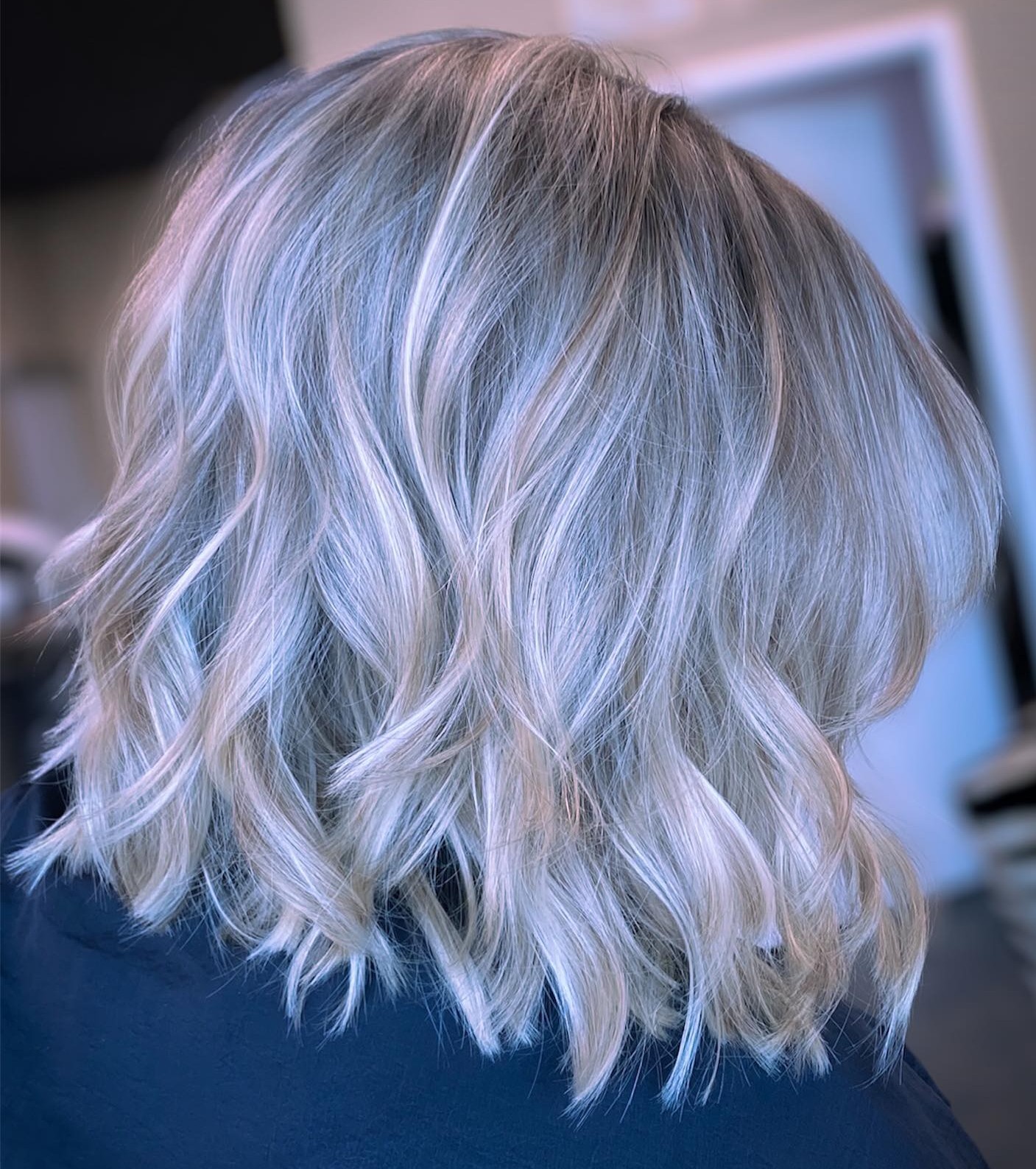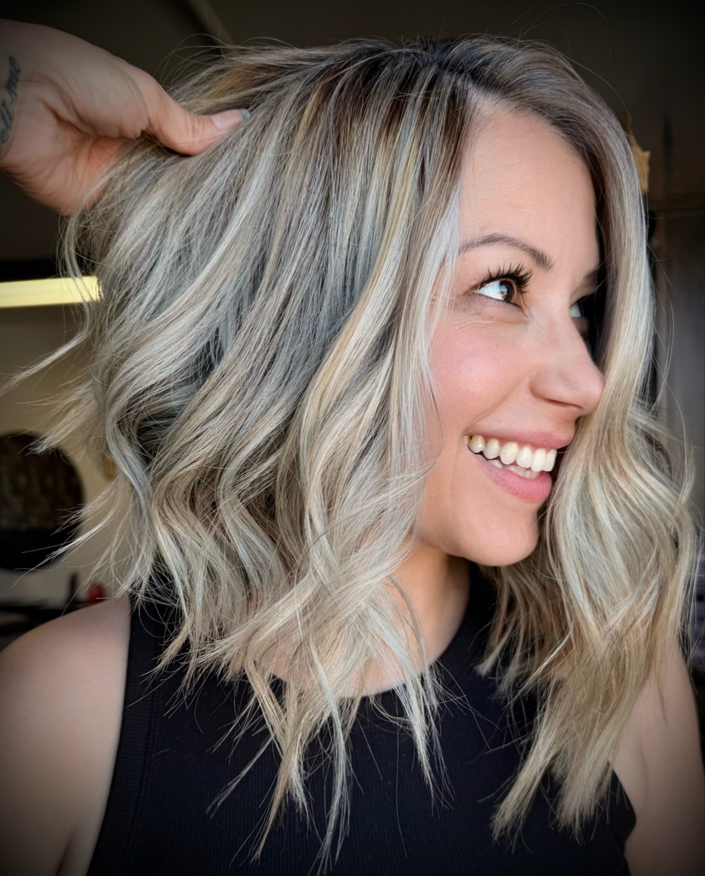 Keep things cool with choppy layers and ashy tones, great for those with a cool skin tone. Babylights (thin highlights) bring the ashy tones from the root downward, saturating the tips with an on-trend gray-blonde color. The ashy brown roots keep the look down-to-earth.