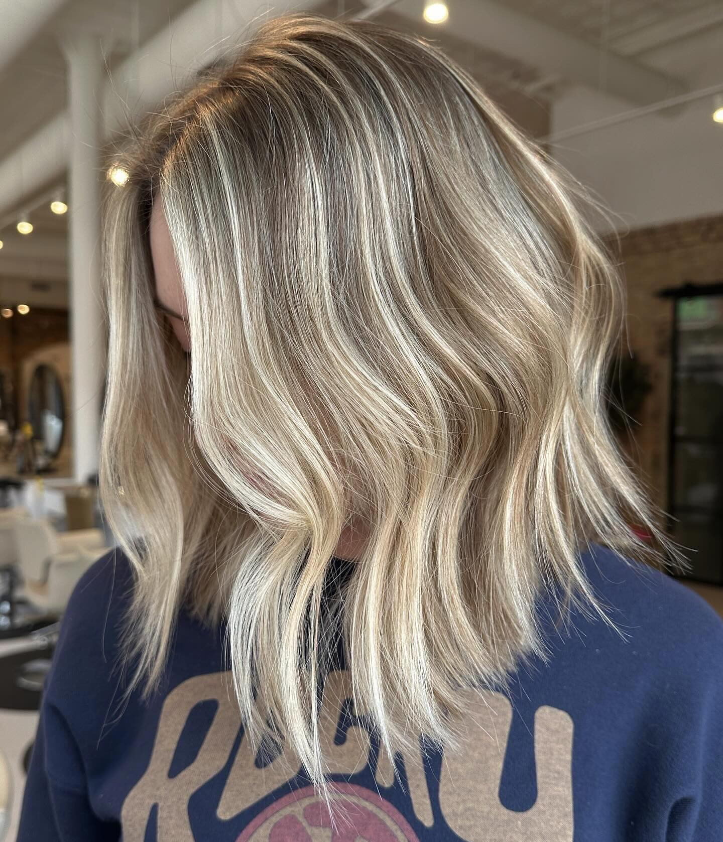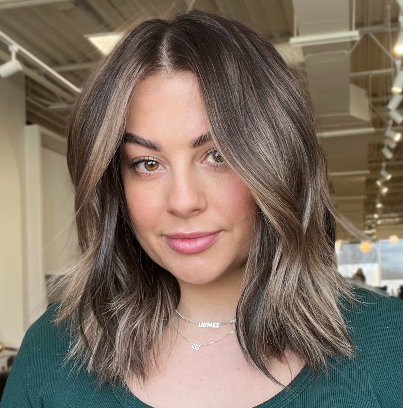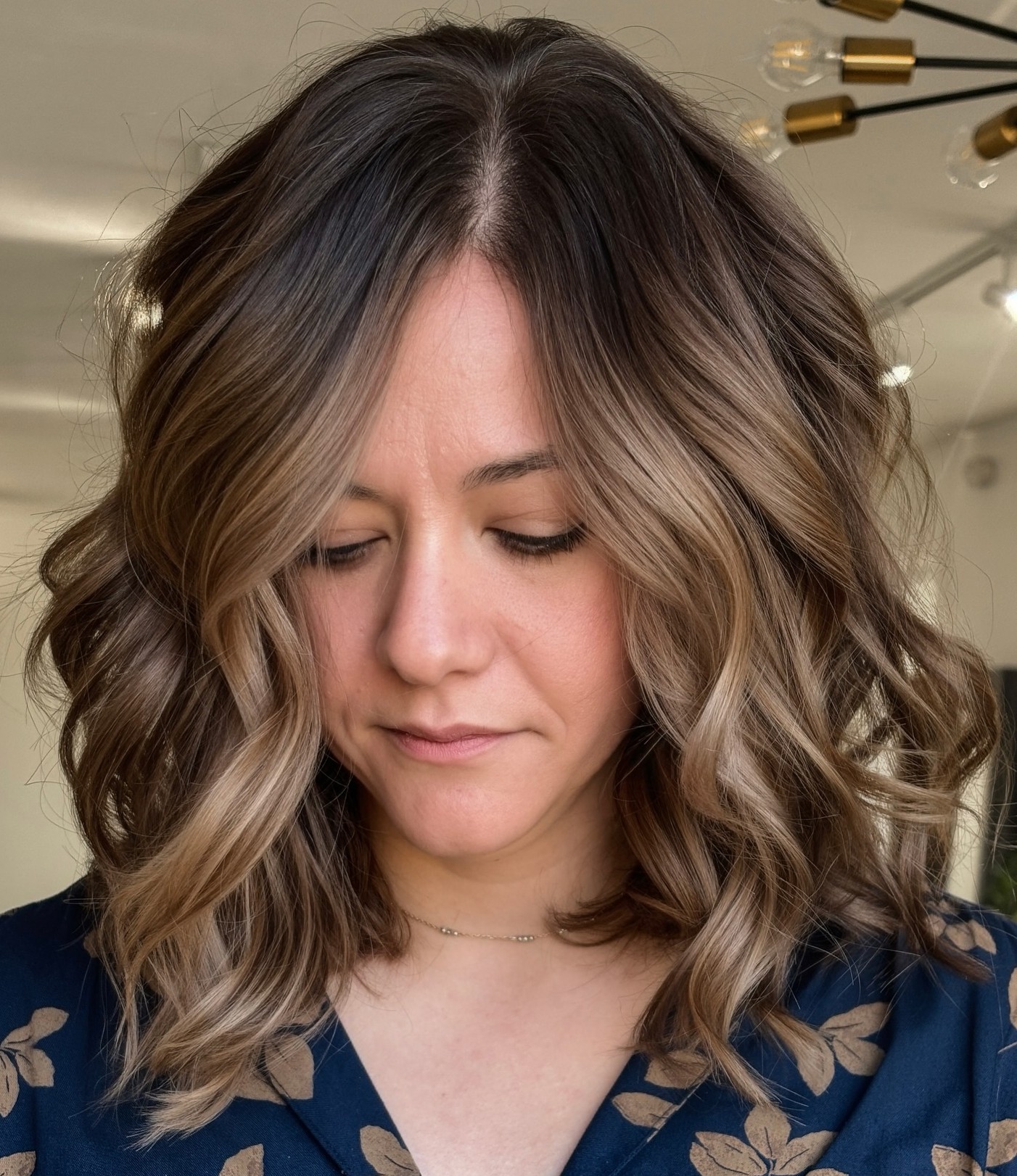A lived-in blonde balayage is perfect for showing off the soft layers and shine of your textured lob. To style this feminine look, use a flat iron and shine serum, and blow-dry with a round brush for added volume.