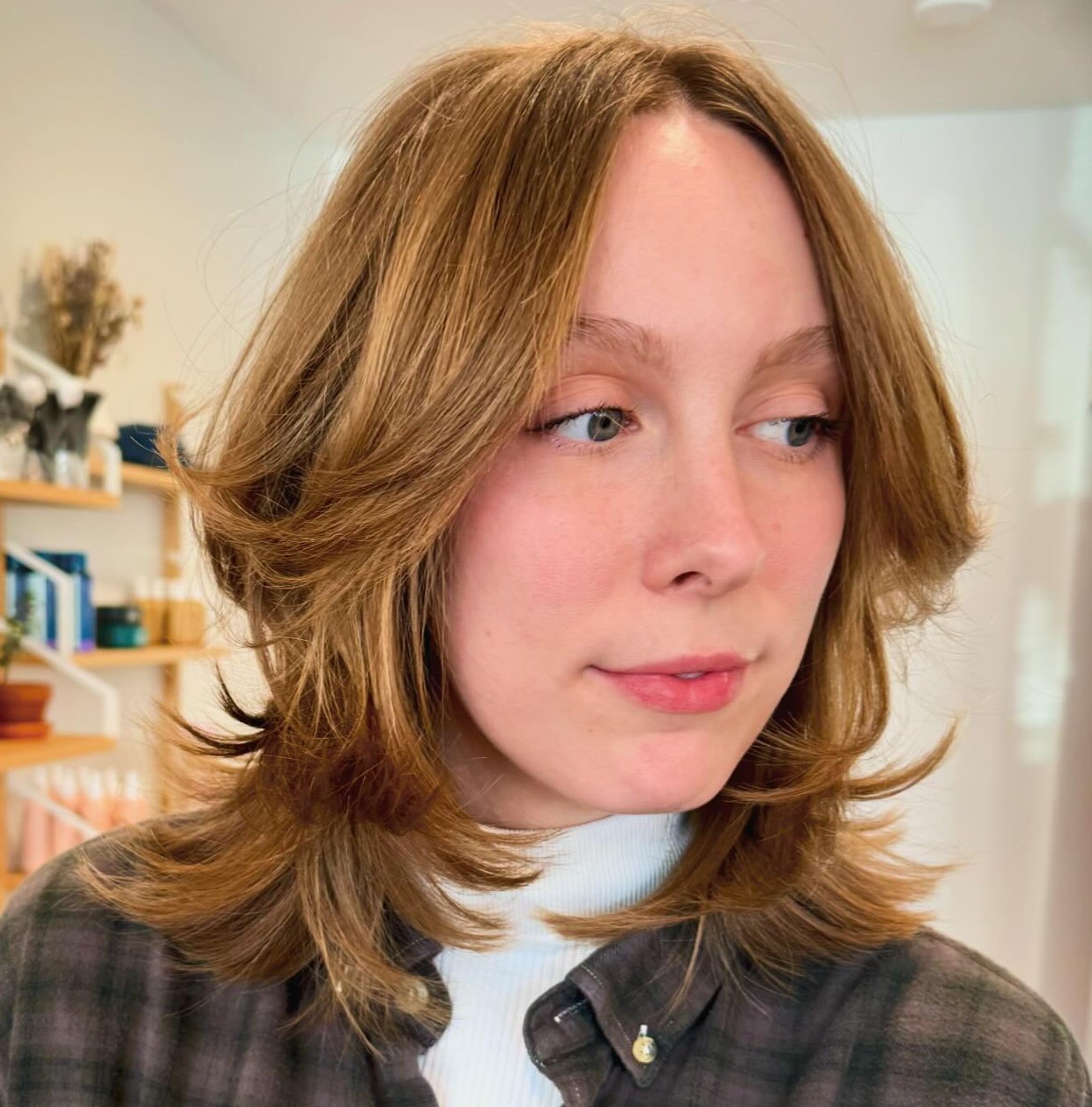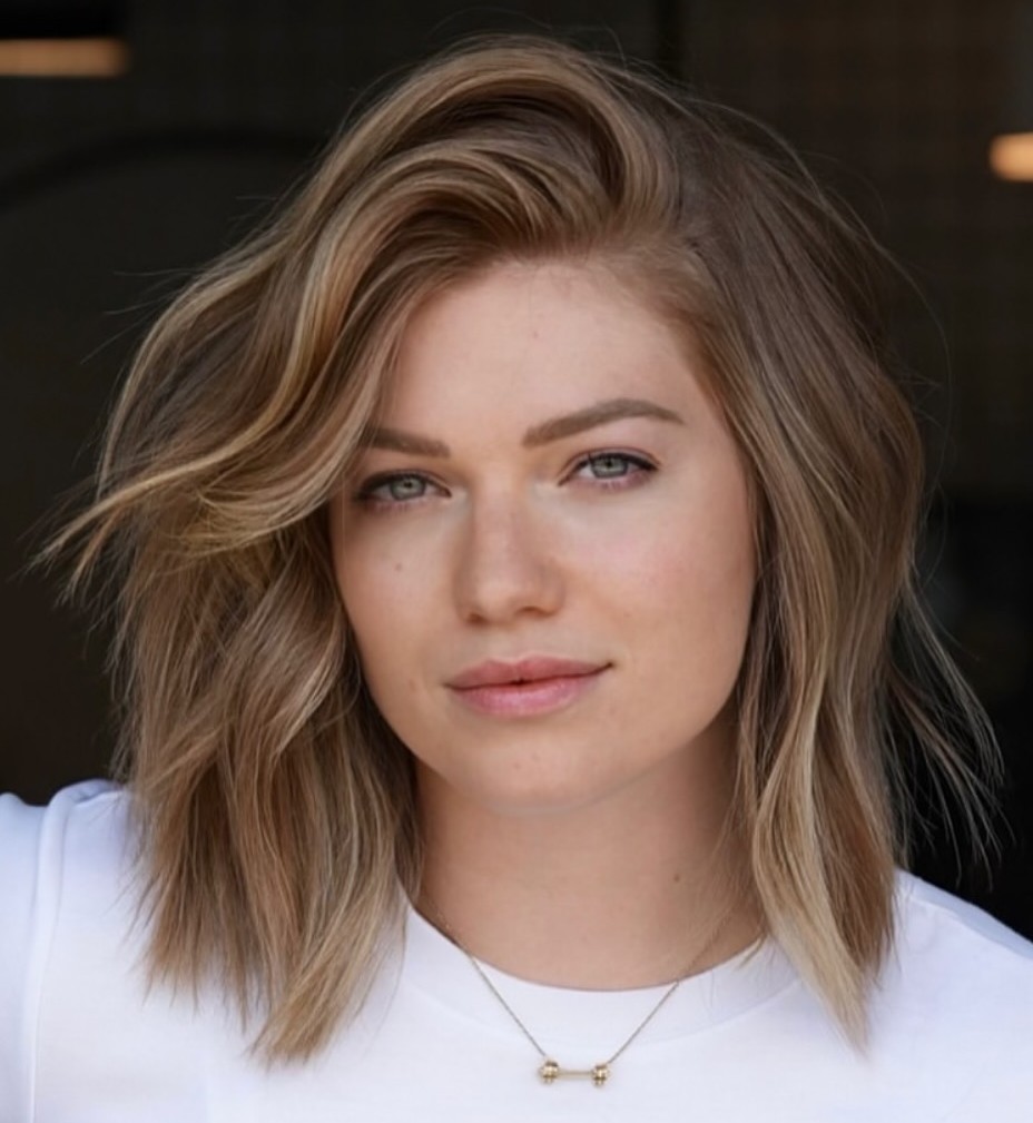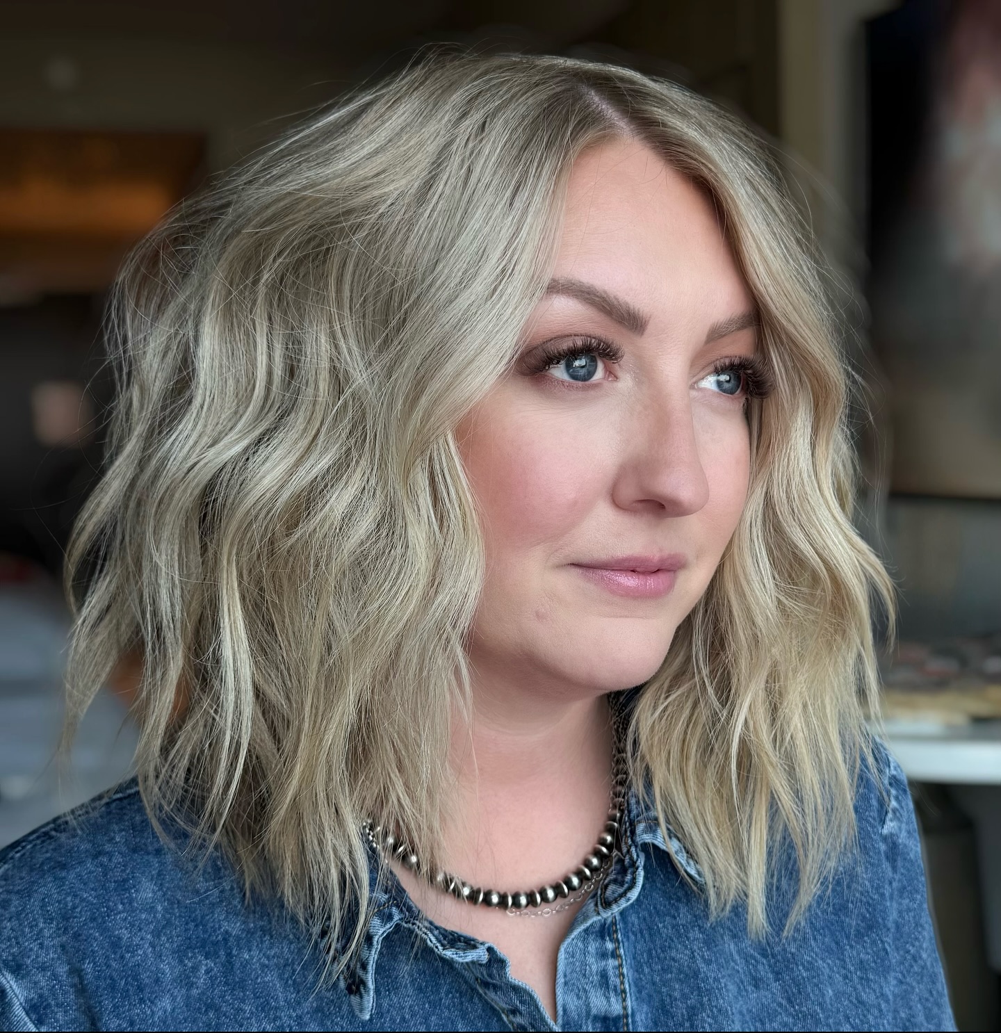 A lived-in blonde balayage is perfect for showing off the soft layers and shine of your textured lob. To style this feminine look, use a flat iron and shine serum, and blow-dry with a round brush for added volume.
