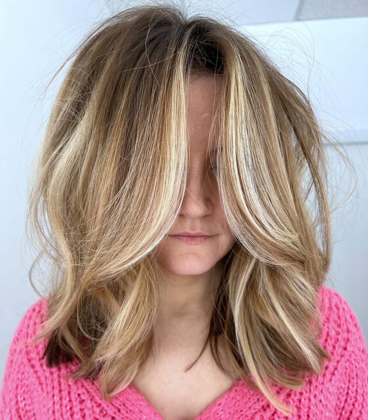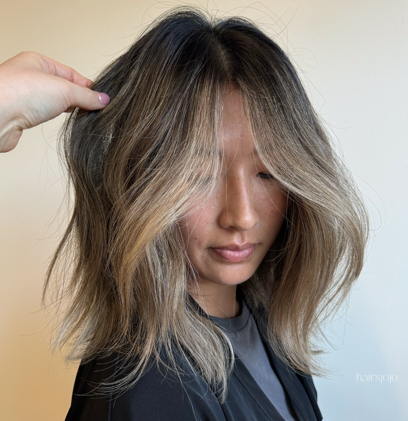 If you can’t decide on a hairstyle, this choppy blonde bob with balayage is a win-win option for you to stand out. With notes of both warm and cool tones, it’ll suit those with a neutral skin tone. The dark roots and the bright blonde pieces strategically placed closer and further to the root means no harsh lines when your natural color grows in.
