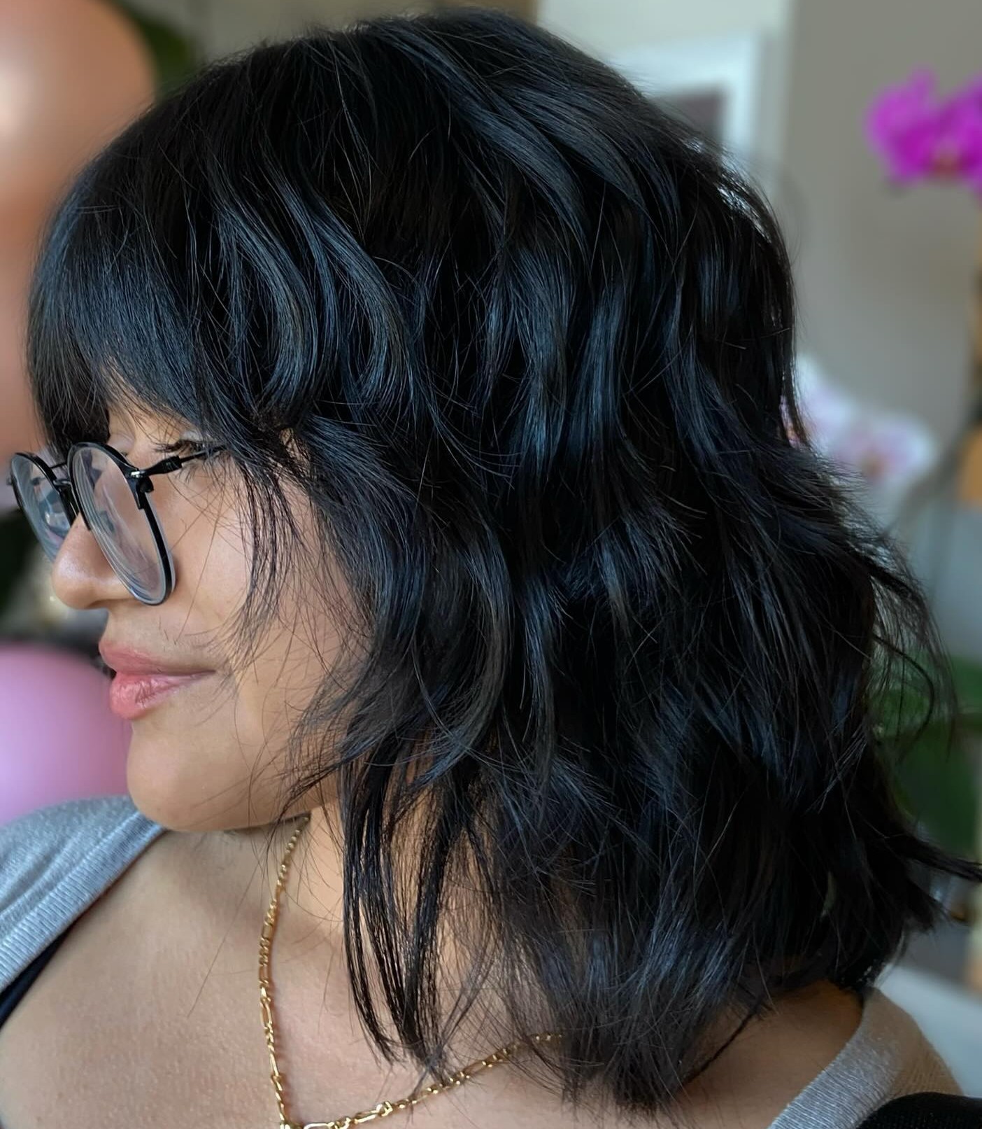 Combine two bold moves in one: bangs and choppy layers. You will find this combination pleasing due to the softening effect it gives to your appearance. Adding subtle highlights to your locks while keeping the bangs natural will bring sultriness and intrigue to your eyes.