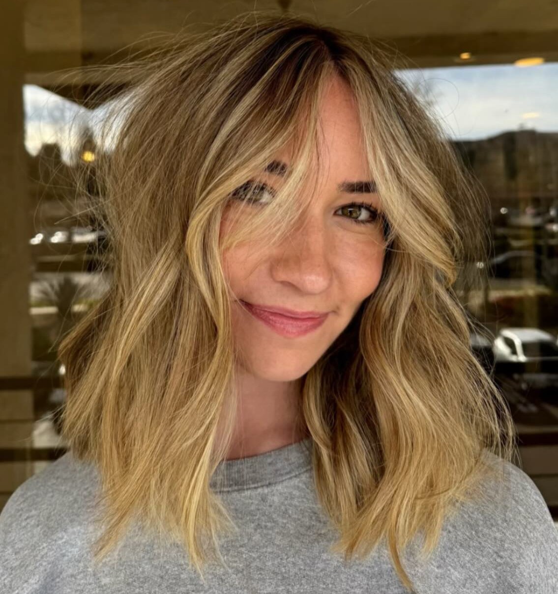 A lived-in blonde balayage is perfect for showing off the soft layers and shine of your textured lob. To style this feminine look, use a flat iron and shine serum, and blow-dry with a round brush for added volume.