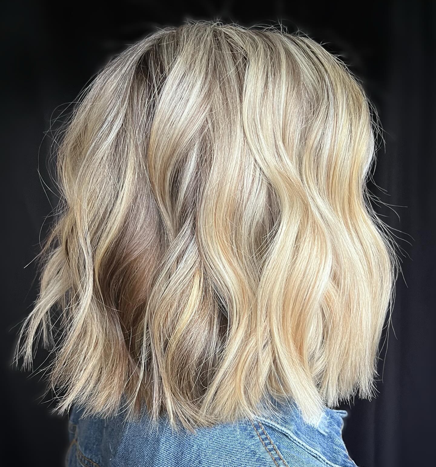 A lived-in blonde balayage is perfect for showing off the soft layers and shine of your textured lob. To style this feminine look, use a flat iron and shine serum, and blow-dry with a round brush for added volume.