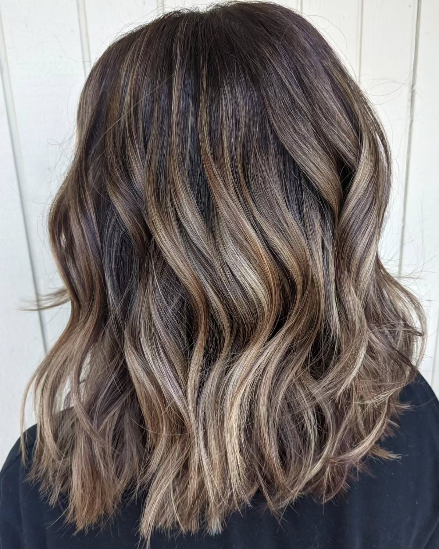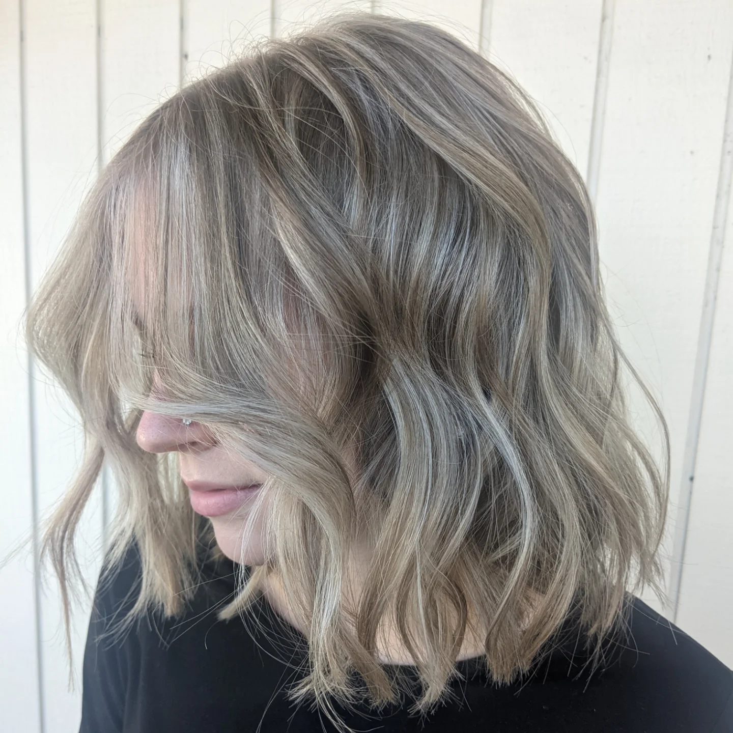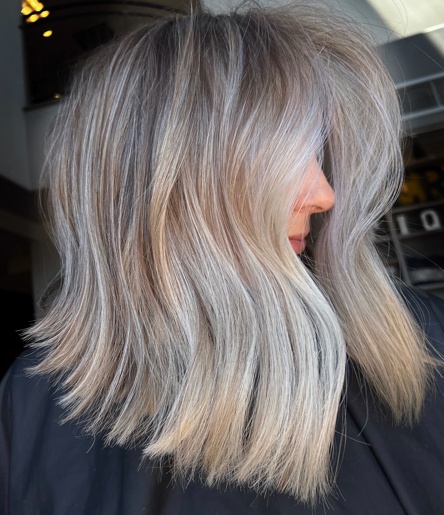 Keep things cool with choppy layers and ashy tones, great for those with a cool skin tone. Babylights (thin highlights) bring the ashy tones from the root downward, saturating the tips with an on-trend gray-blonde color. The ashy brown roots keep the look down-to-earth.