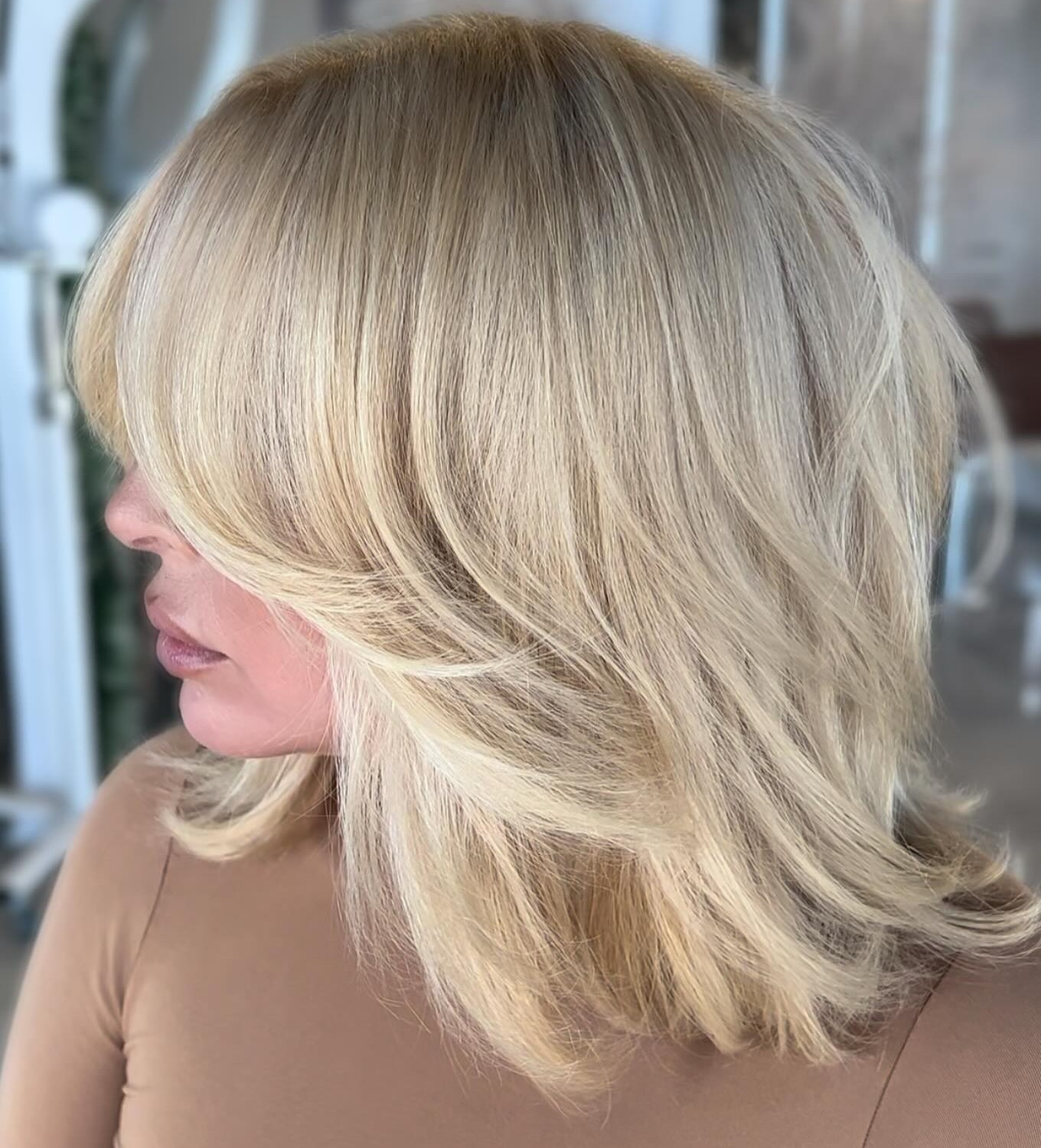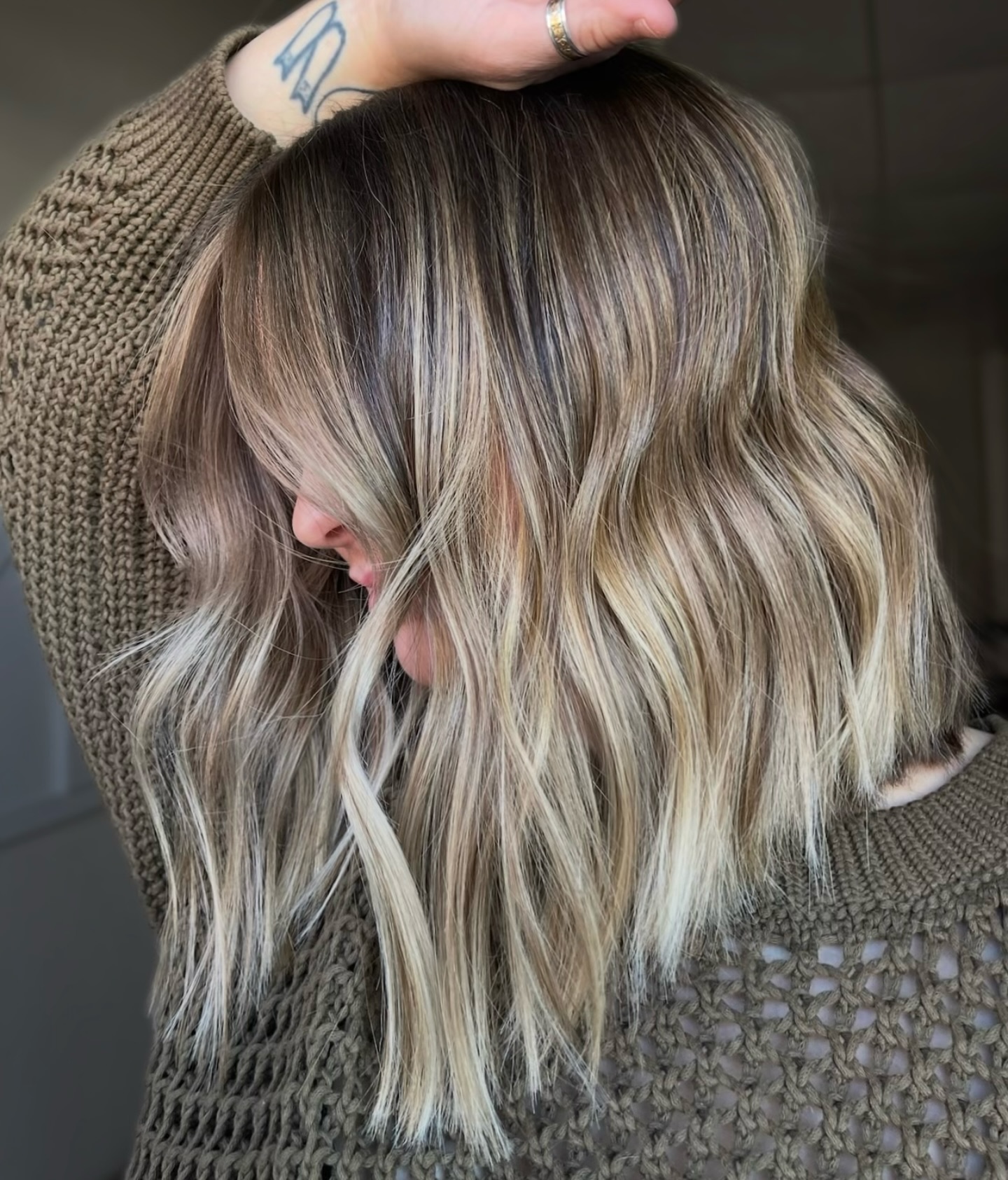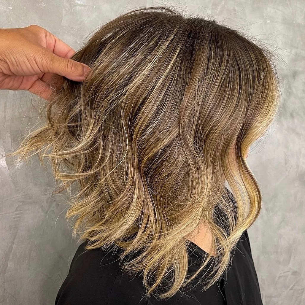 A lived-in blonde balayage is perfect for showing off the soft layers and shine of your textured lob. To style this feminine look, use a flat iron and shine serum, and blow-dry with a round brush for added volume.
