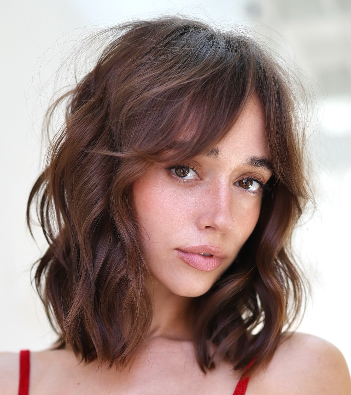 Combine two bold moves in one: bangs and choppy layers. You will find this combination pleasing due to the softening effect it gives to your appearance. Adding subtle highlights to your locks while keeping the bangs natural will bring sultriness and intrigue to your eyes.