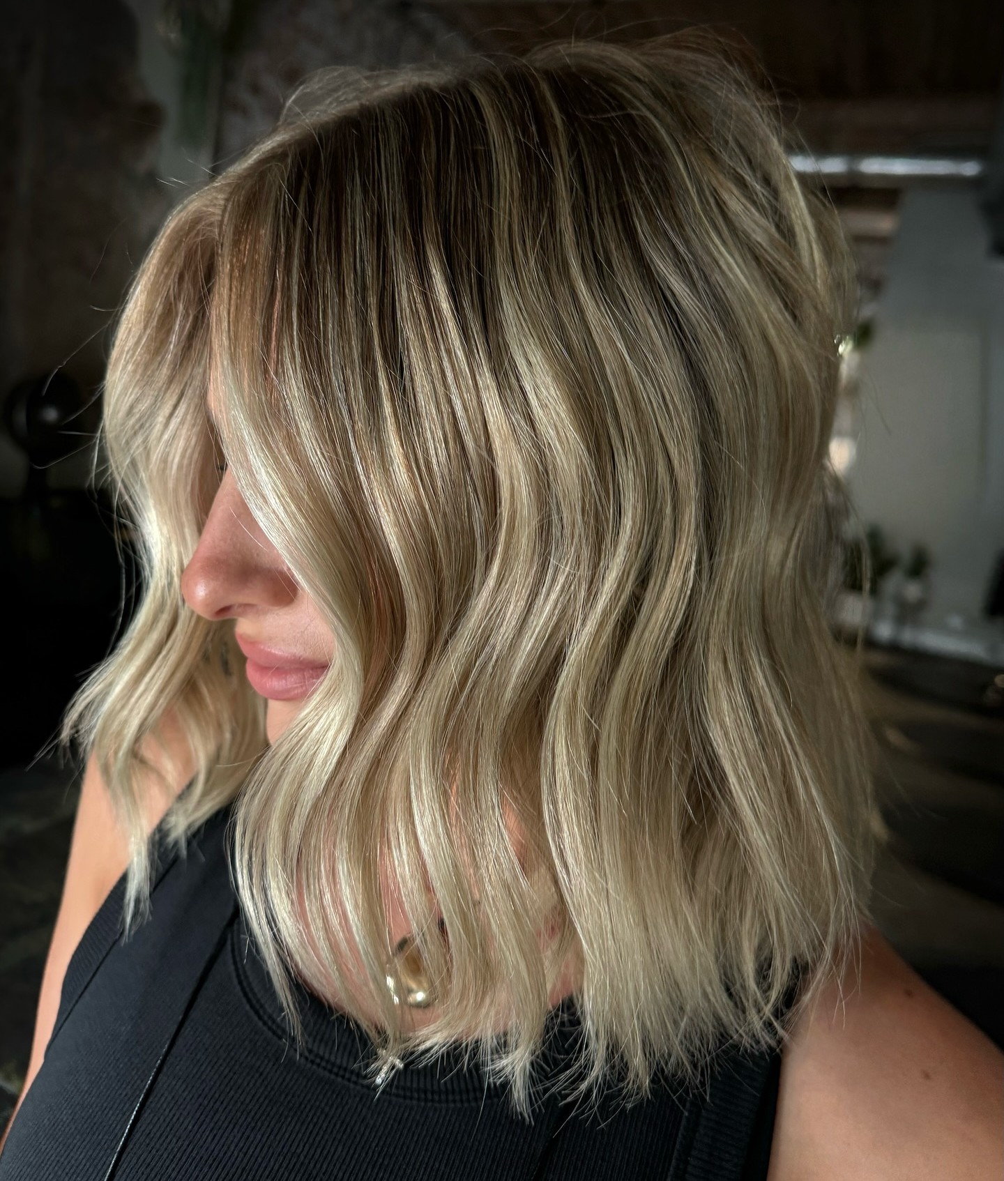 A lived-in blonde balayage is perfect for showing off the soft layers and shine of your textured lob. To style this feminine look, use a flat iron and shine serum, and blow-dry with a round brush for added volume.