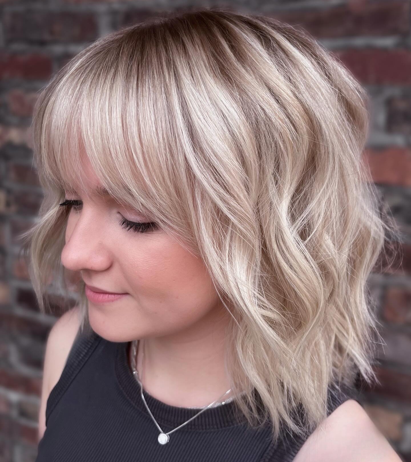 Aim for a longer length but still yearning for a “lob”? This long blonde bob sports textured waves, adding an ultra-modern feel. The fully highlighted and somewhat messy style is perfect for a summertime beachy short-hair-don’t-care attitude.