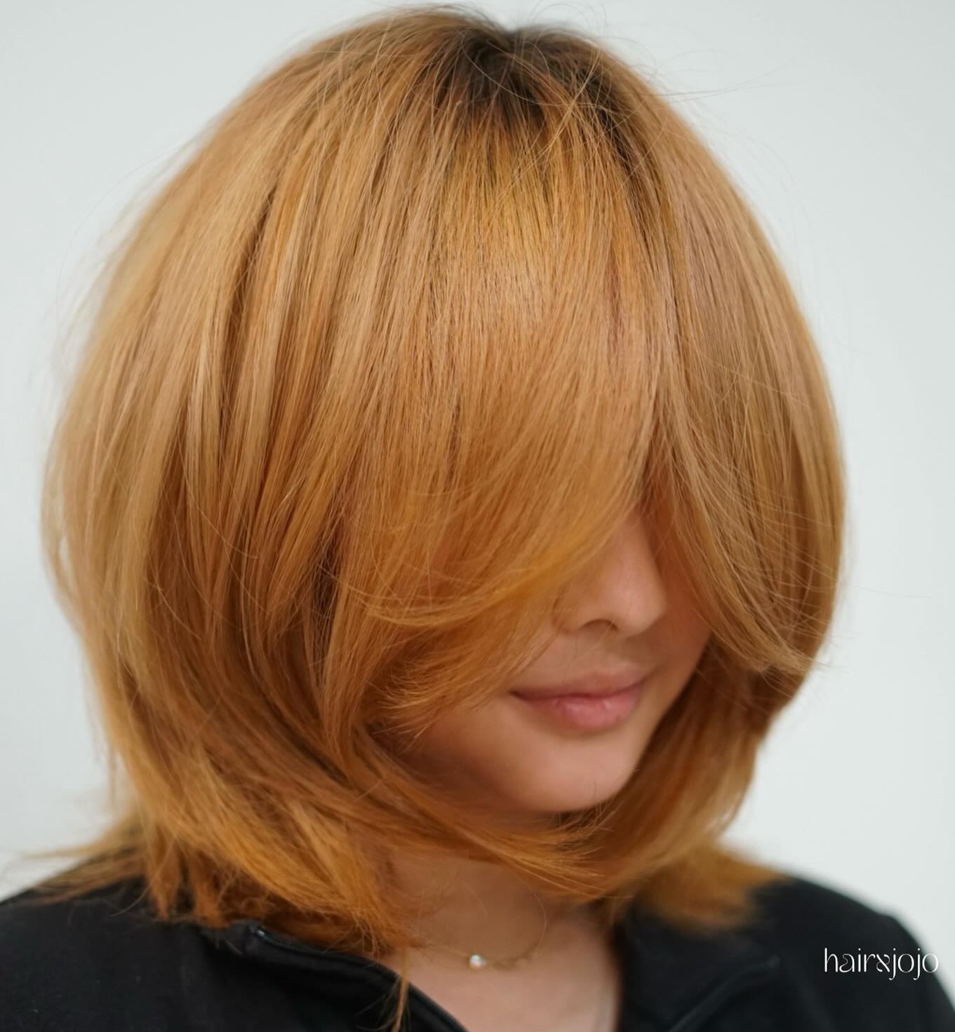 Slightly textured and hand-painted with subtle highlights, this cut is a trendy and low-maintenance option for women with round face shapes. Pair it with heavy bangs to achieve an alluring style that accentuates straight tresses.