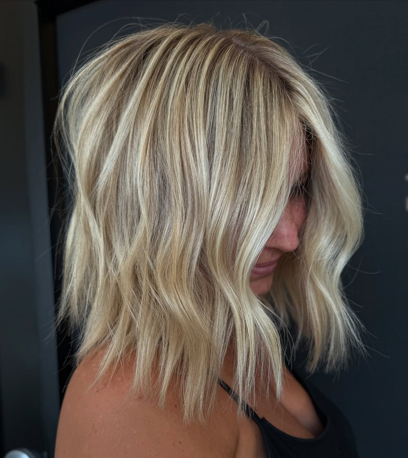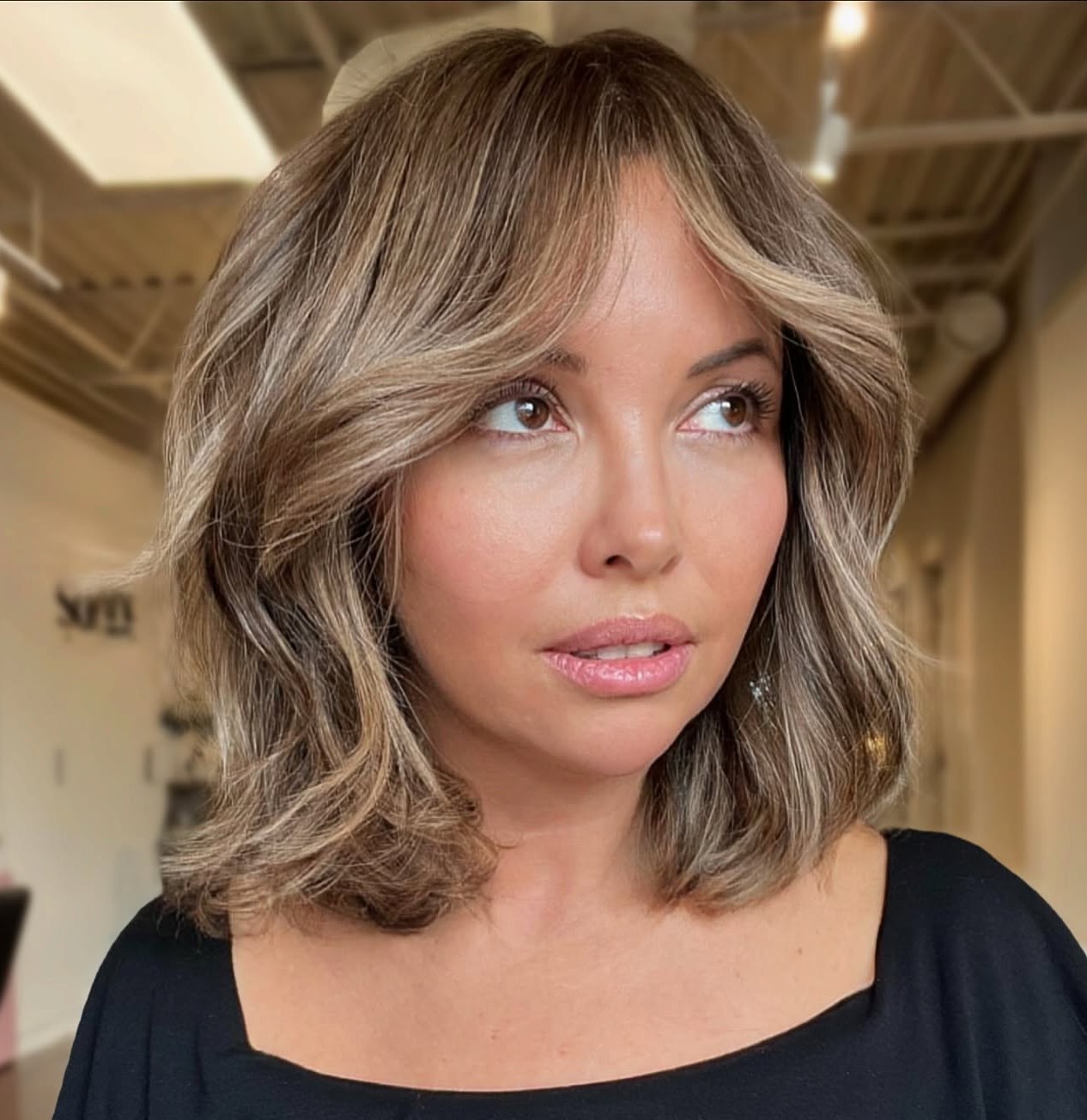 A lived-in blonde balayage is perfect for showing off the soft layers and shine of your textured lob. To style this feminine look, use a flat iron and shine serum, and blow-dry with a round brush for added volume.