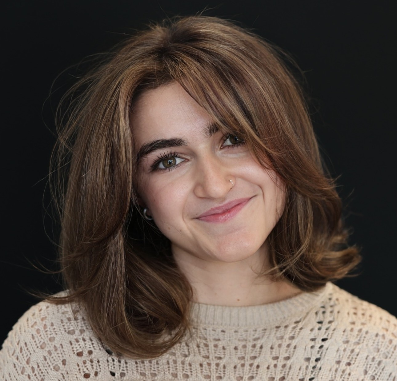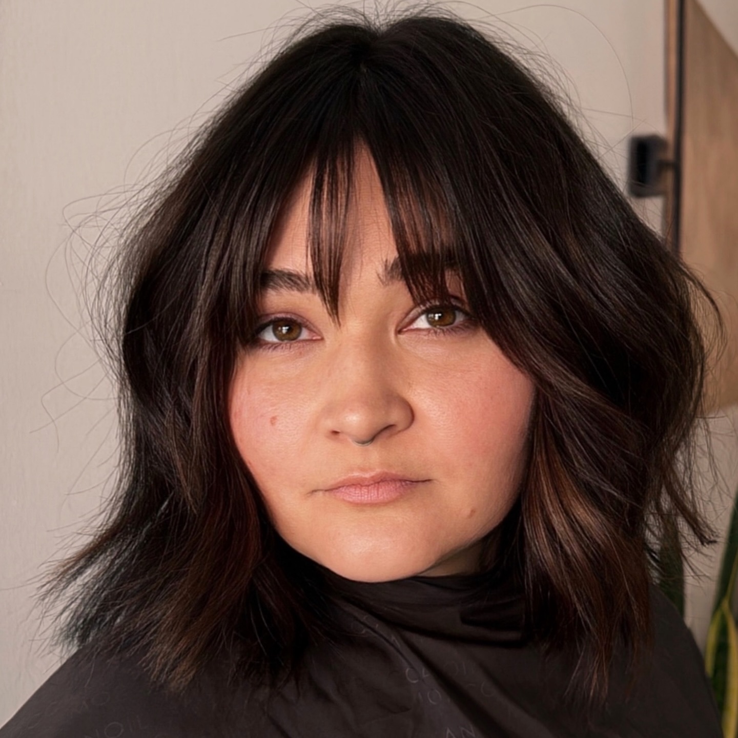 This choppy angled haircut is a fresh take on the traditional A-line bob. The simple texture and the elongated face-framing pieces add a sense of a “soft edge.” A beautiful balayage technique brightens the brunette shade and adds dimension to each angle for an overall put-together look that doesn’t try too hard.