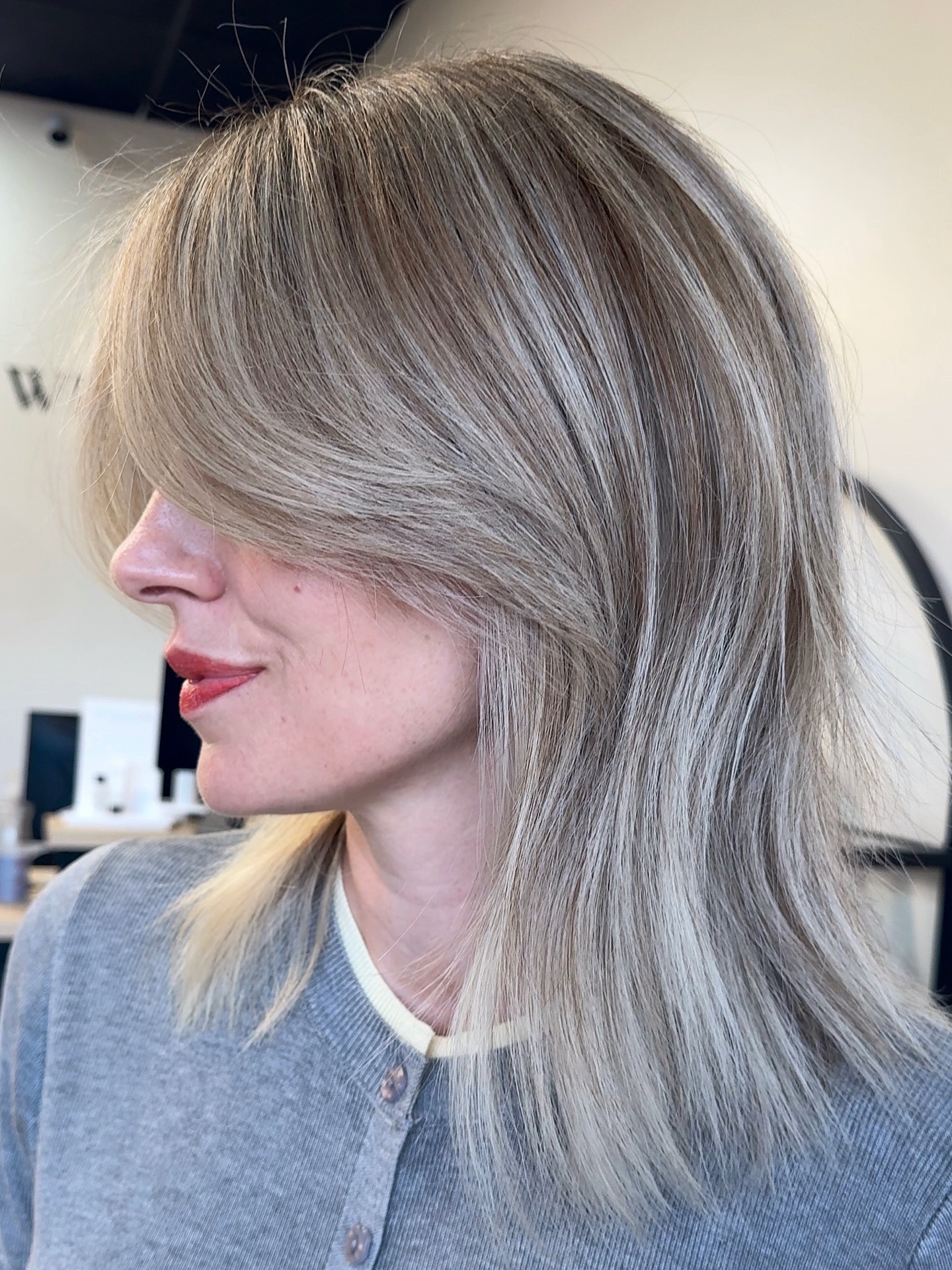 Keep things cool with choppy layers and ashy tones, great for those with a cool skin tone. Babylights (thin highlights) bring the ashy tones from the root downward, saturating the tips with an on-trend gray-blonde color. The ashy brown roots keep the look down-to-earth.