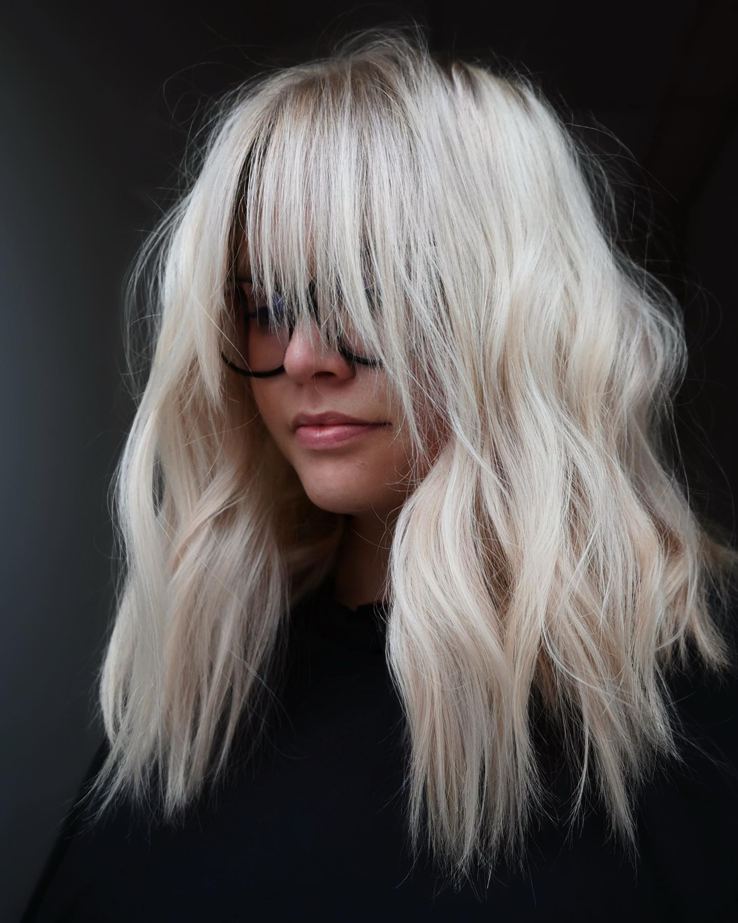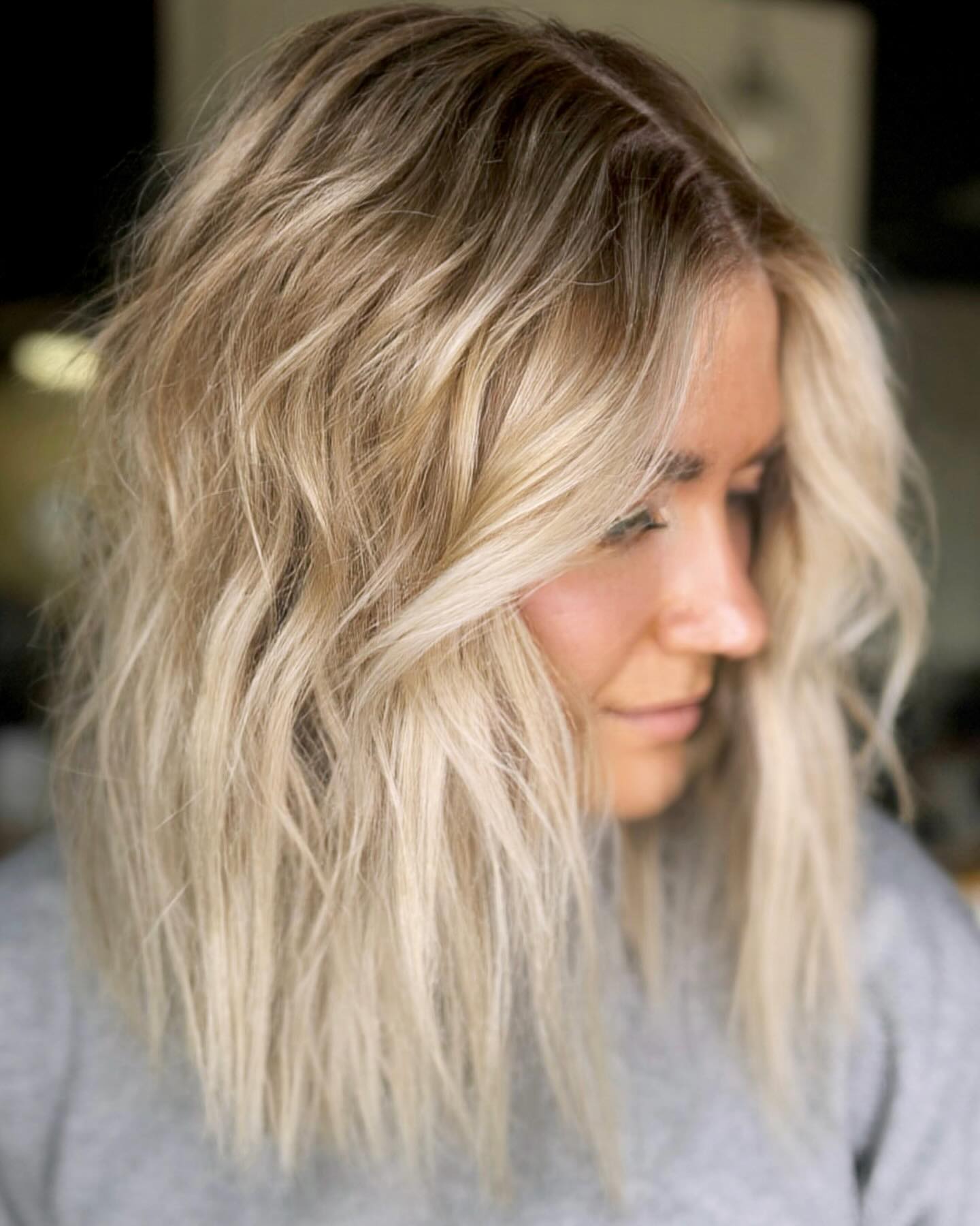 Keep things cool with choppy layers and ashy tones, great for those with a cool skin tone. Babylights (thin highlights) bring the ashy tones from the root downward, saturating the tips with an on-trend gray-blonde color. The ashy brown roots keep the look down-to-earth.