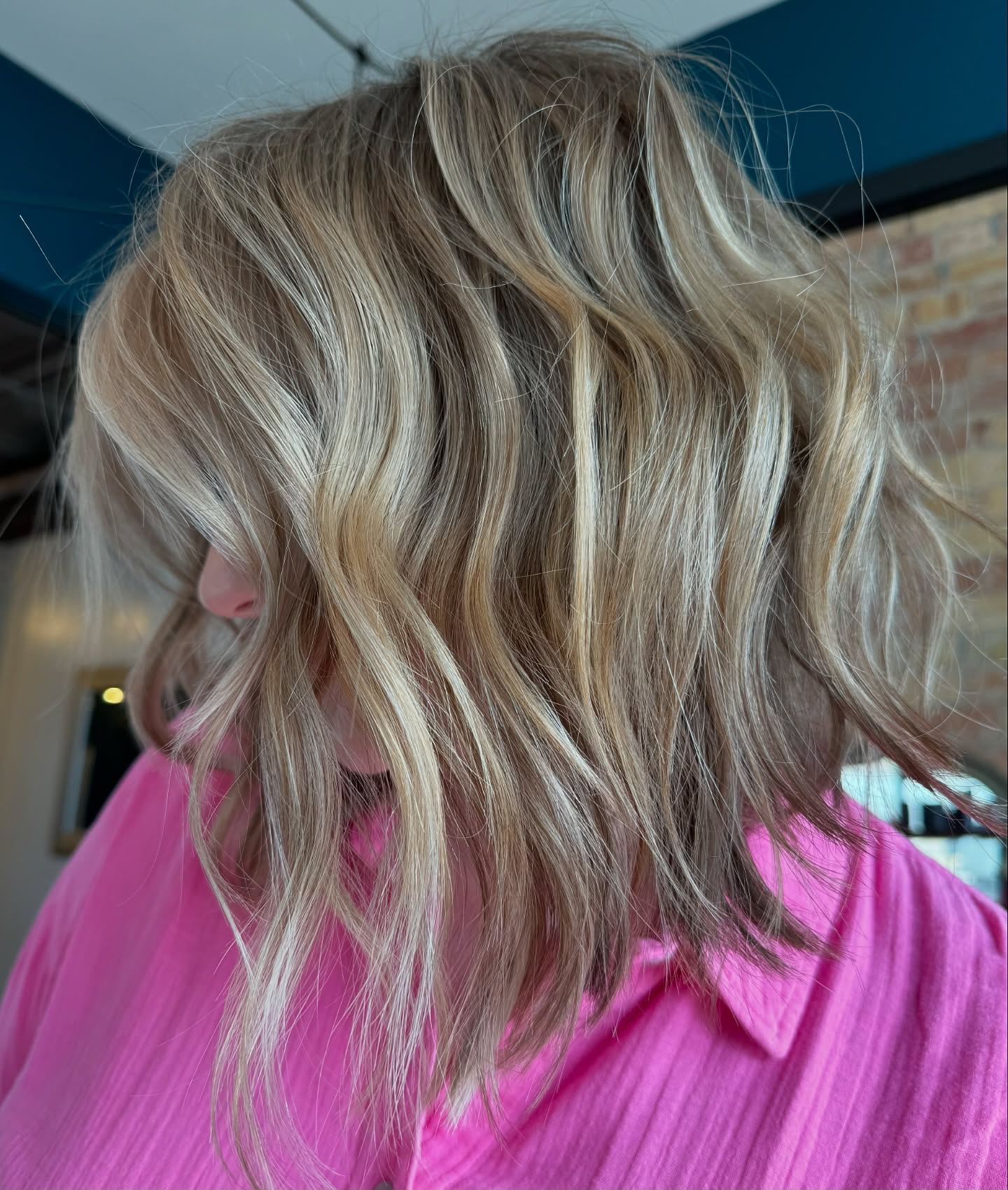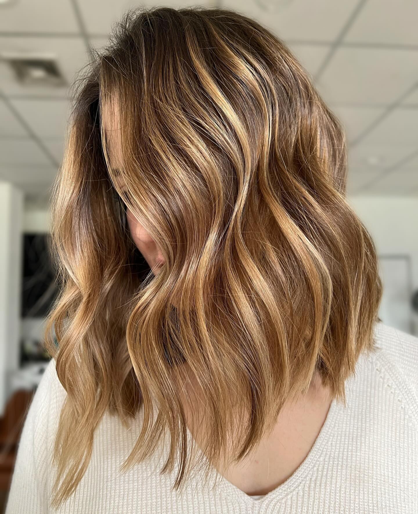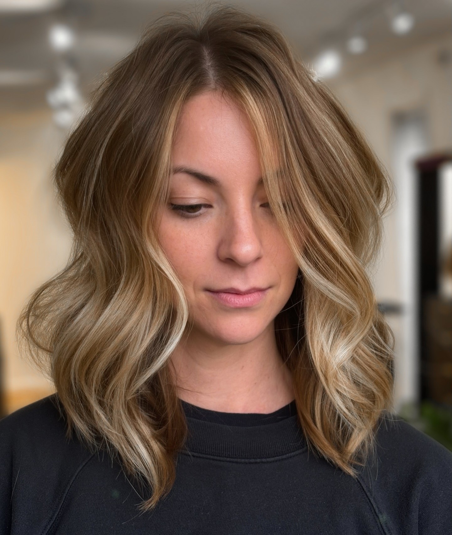 A lived-in blonde balayage is perfect for showing off the soft layers and shine of your textured lob. To style this feminine look, use a flat iron and shine serum, and blow-dry with a round brush for added volume.