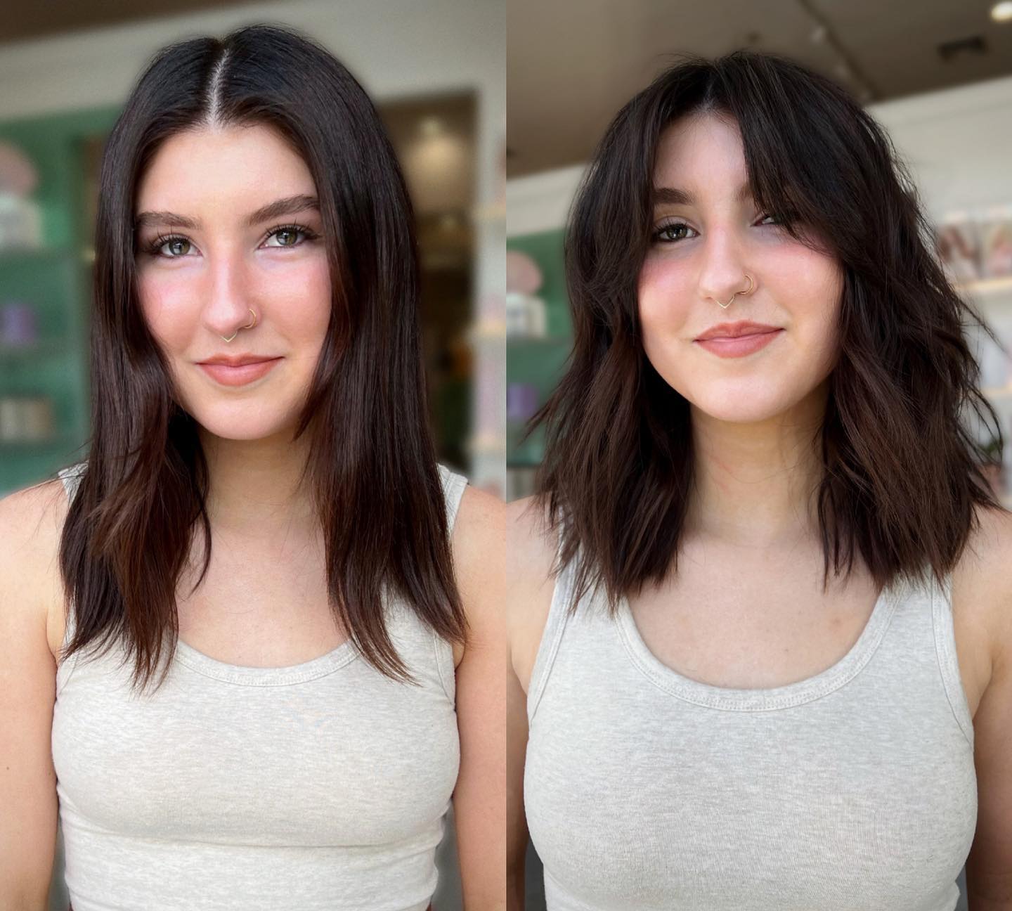 This choppy angled haircut is a fresh take on the traditional A-line bob. The simple texture and the elongated face-framing pieces add a sense of a “soft edge.” A beautiful balayage technique brightens the brunette shade and adds dimension to each angle for an overall put-together look that doesn’t try too hard.