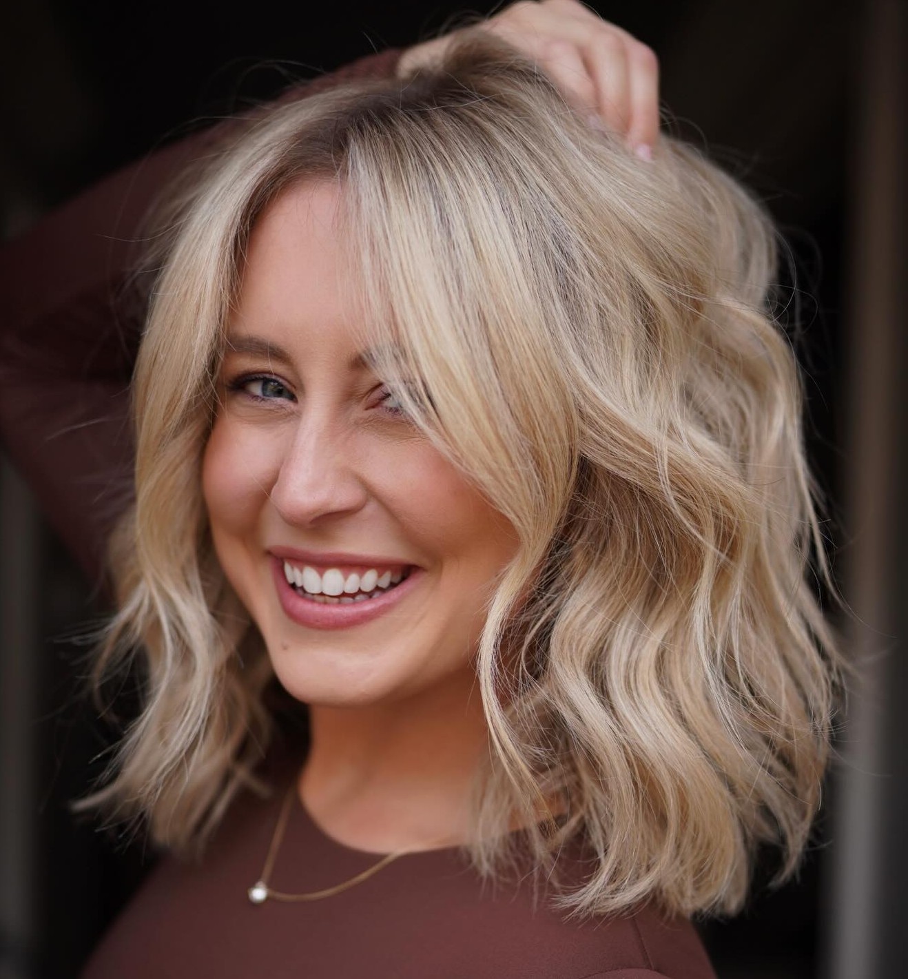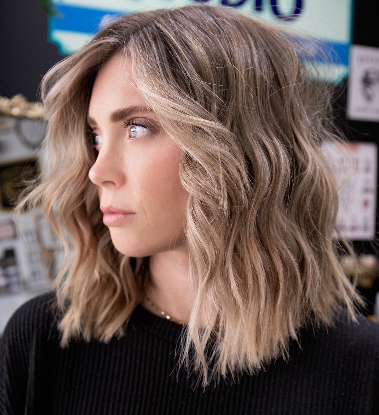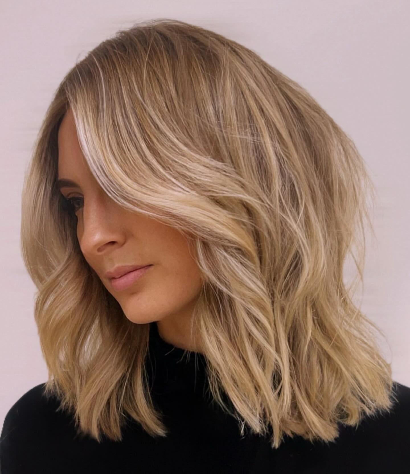 A lived-in blonde balayage is perfect for showing off the soft layers and shine of your textured lob. To style this feminine look, use a flat iron and shine serum, and blow-dry with a round brush for added volume.