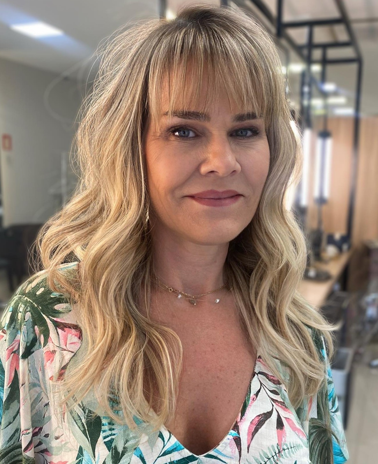 Blonde layered locks and a textured fringe always look stylish, no matter your age. Switching from regular foil highlights to a softer, more blended balayage will give your hairdo a modern vibe.