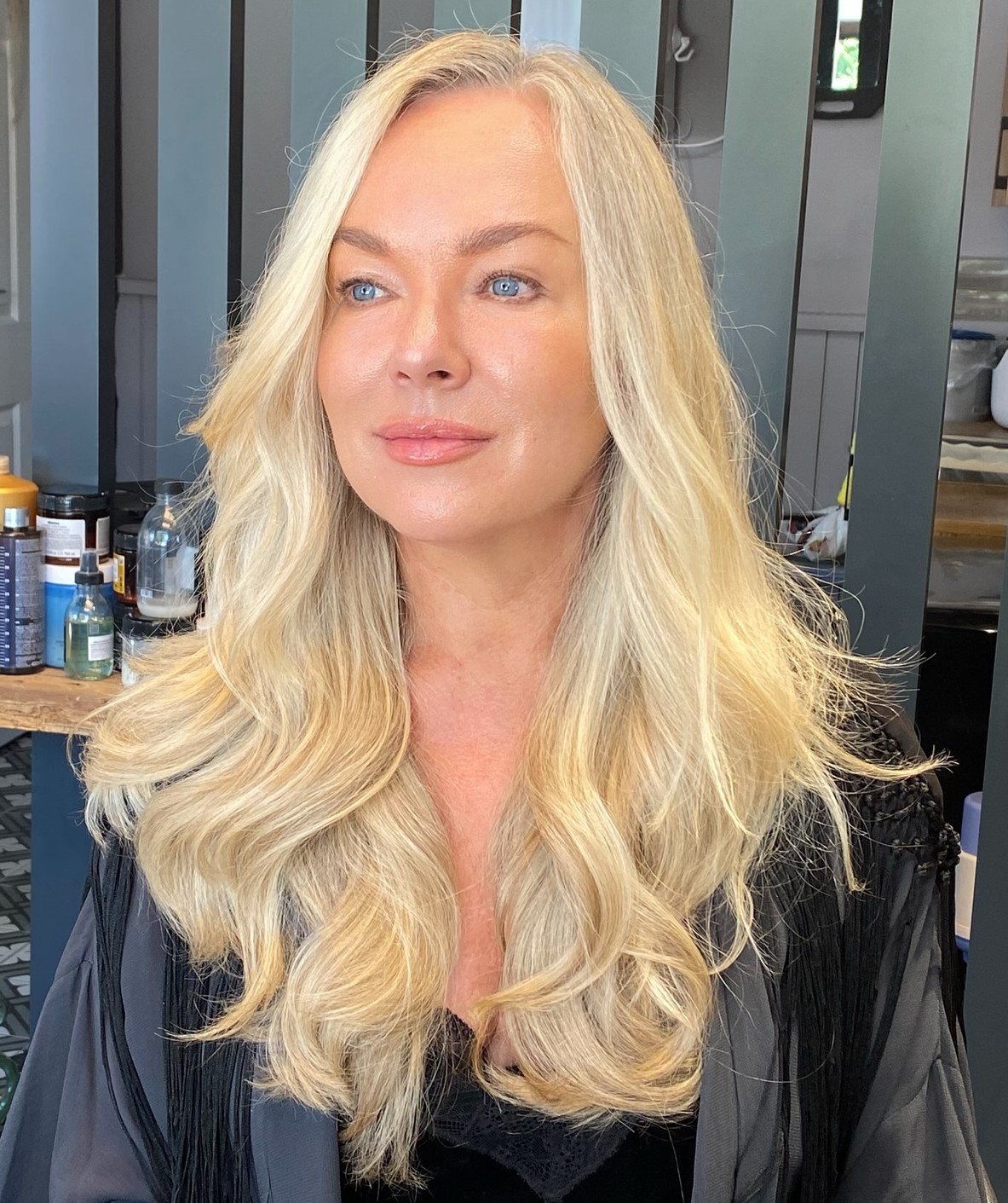 Blonde layered locks and a textured fringe always look stylish, no matter your age. Switching from regular foil highlights to a softer, more blended balayage will give your hairdo a modern vibe.