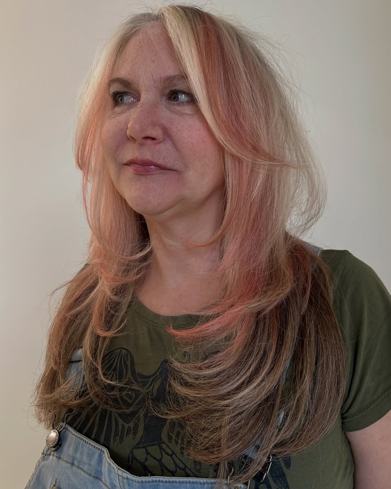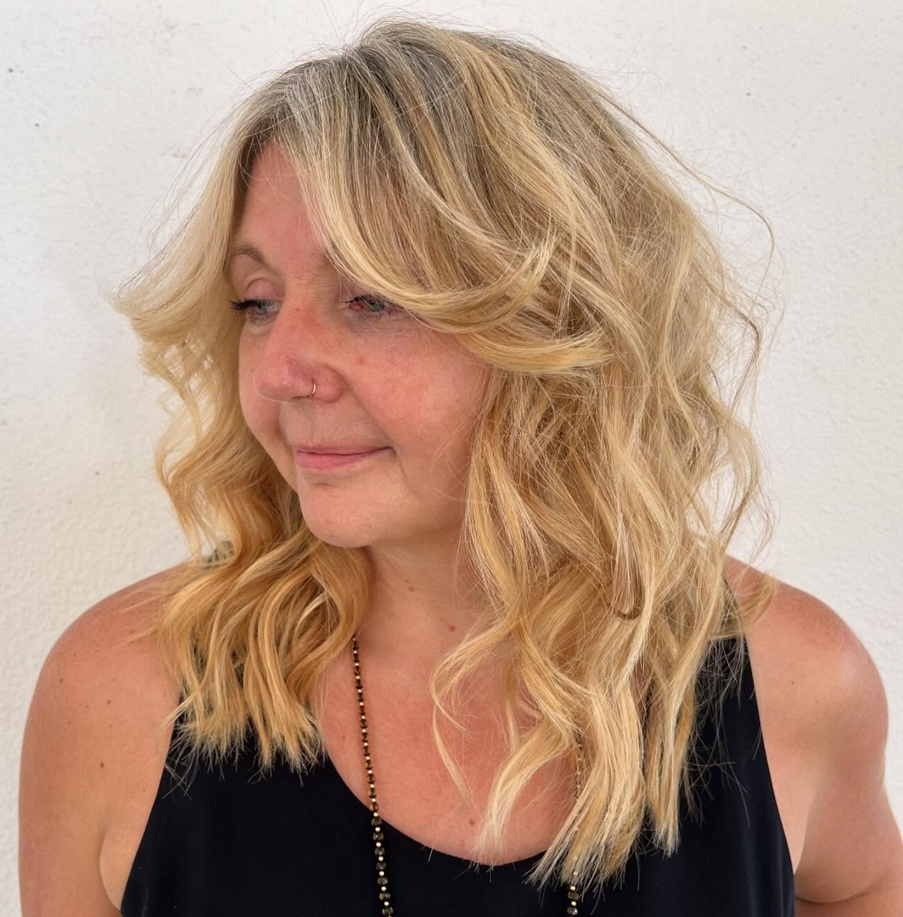 Blonde layered locks and a textured fringe always look stylish, no matter your age. Switching from regular foil highlights to a softer, more blended balayage will give your hairdo a modern vibe.