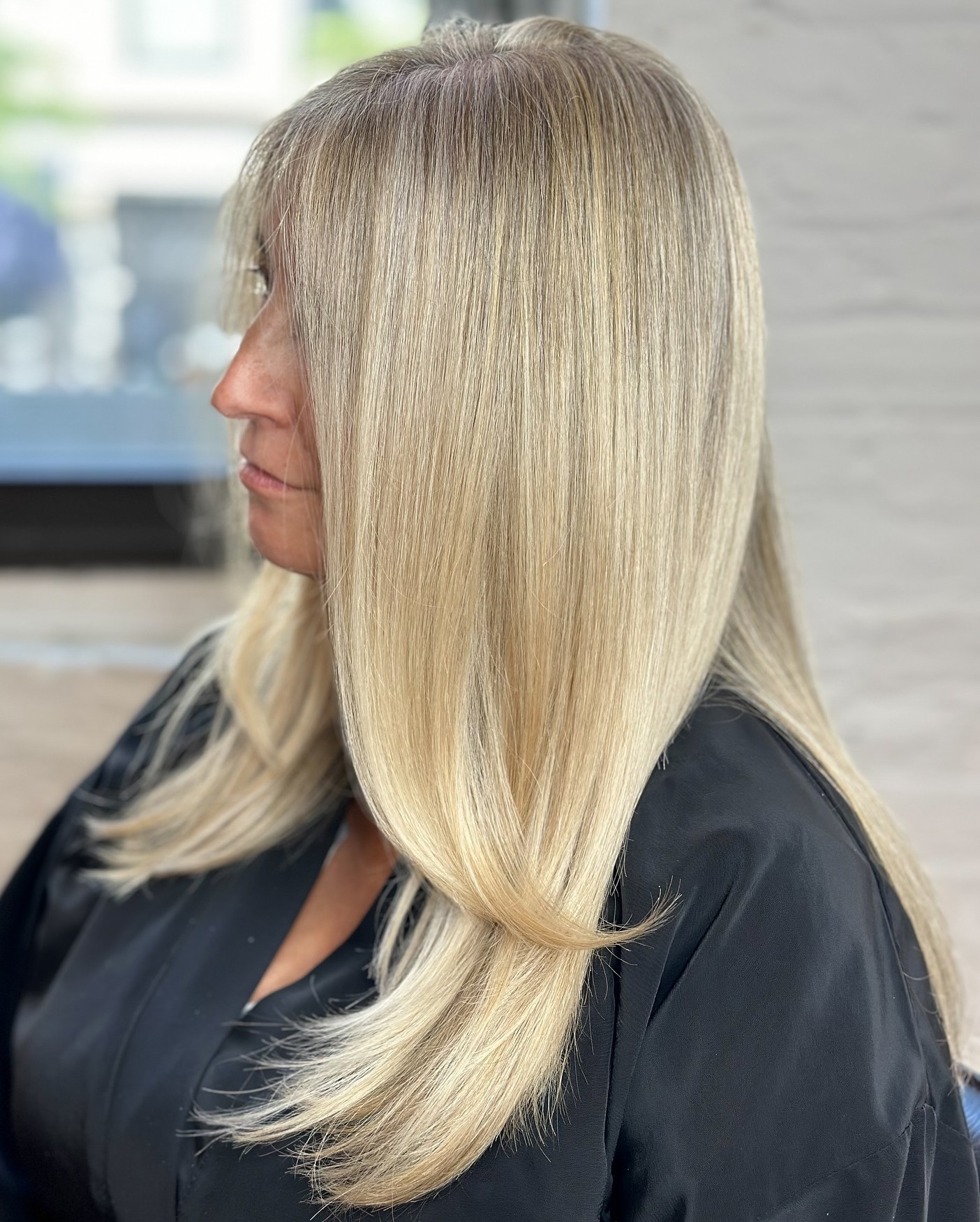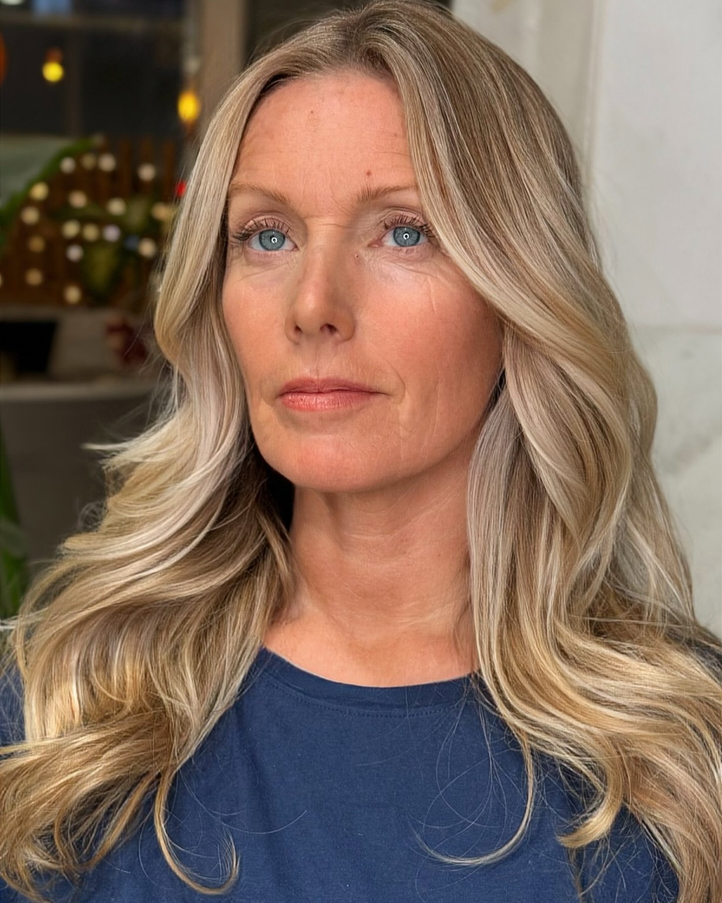 Blonde layered locks and a textured fringe always look stylish, no matter your age. Switching from regular foil highlights to a softer, more blended balayage will give your hairdo a modern vibe.