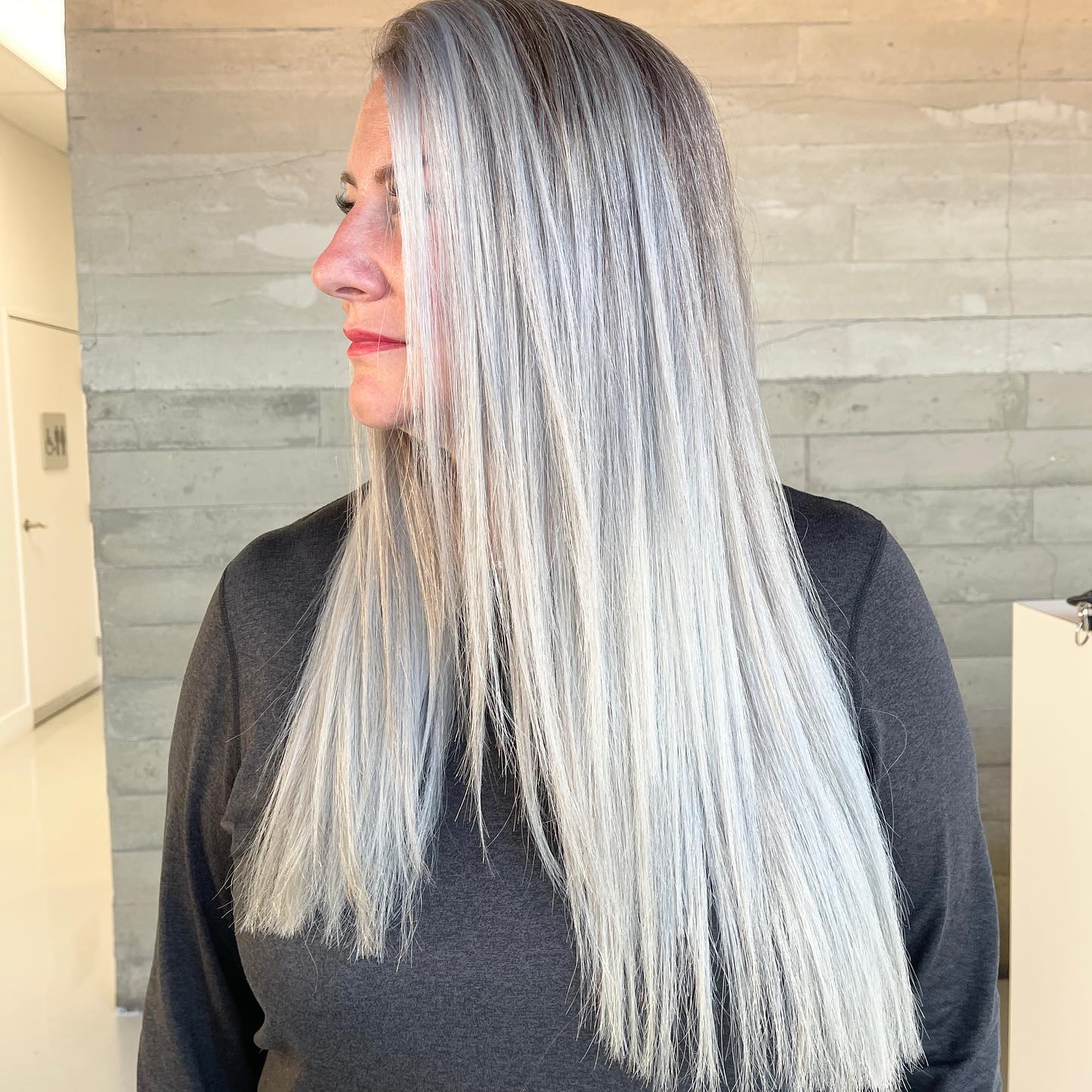 Although the ttransition from dyed hair to your natural gray can be long and expensive, this is so worth the effort! Also, the investment will pay back as a major saving on all the future color appointments that you will skip.