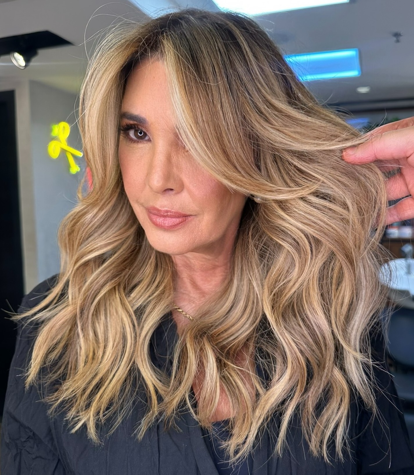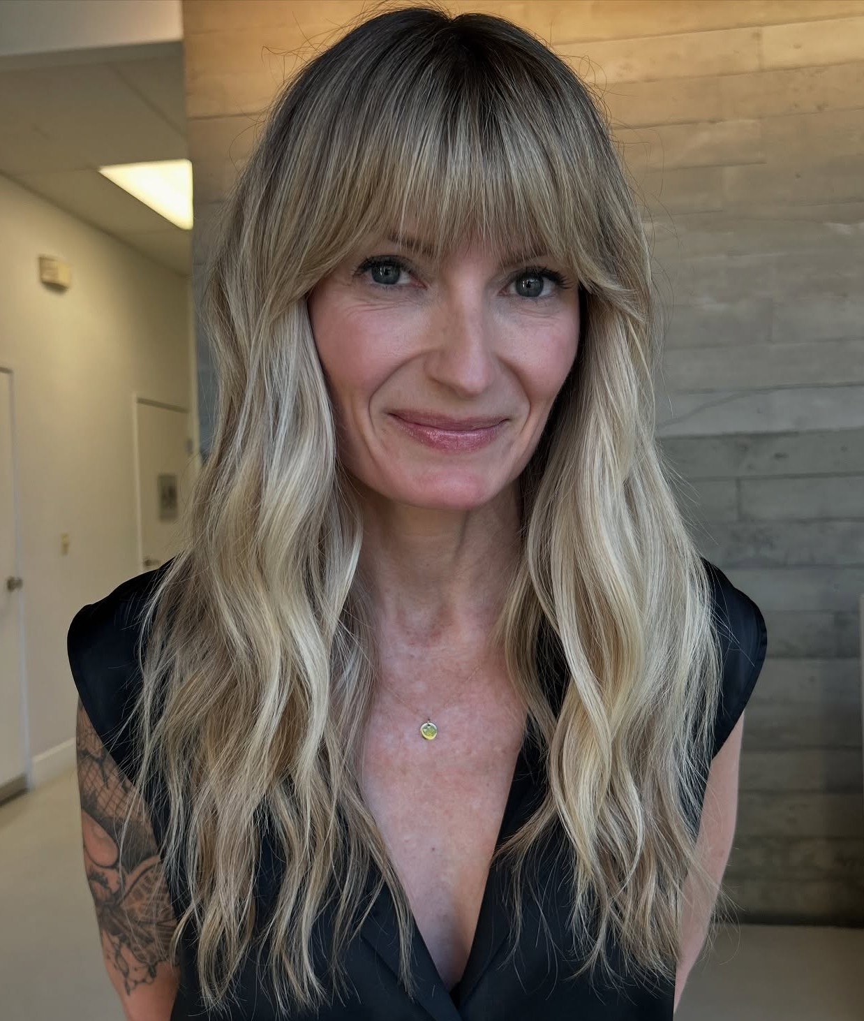 Blonde layered locks and a textured fringe always look stylish, no matter your age. Switching from regular foil highlights to a softer, more blended balayage will give your hairdo a modern vibe.