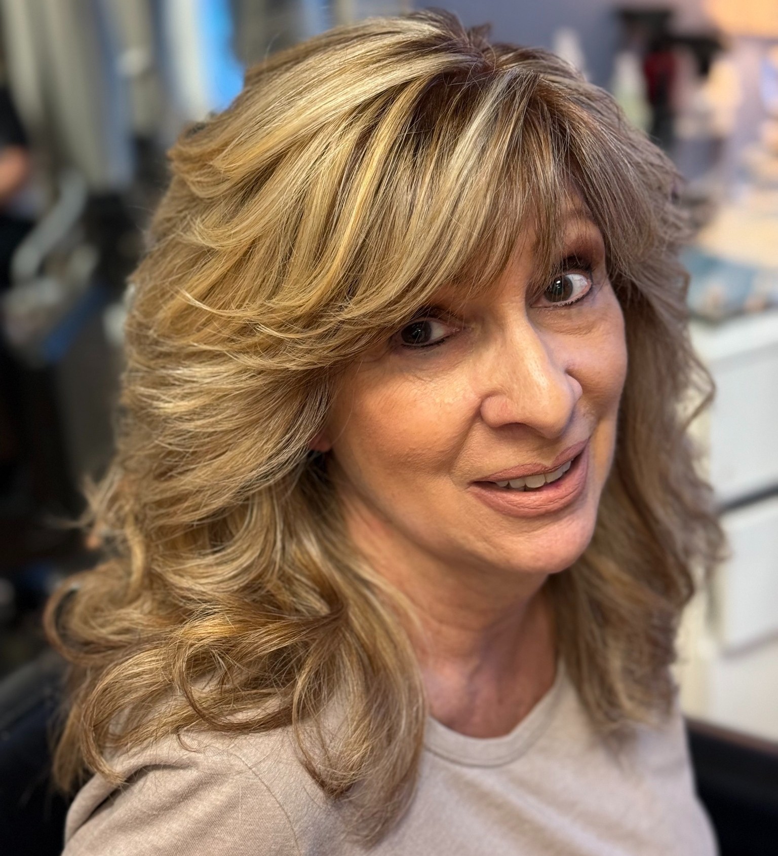 Blonde layered locks and a textured fringe always look stylish, no matter your age. Switching from regular foil highlights to a softer, more blended balayage will give your hairdo a modern vibe.