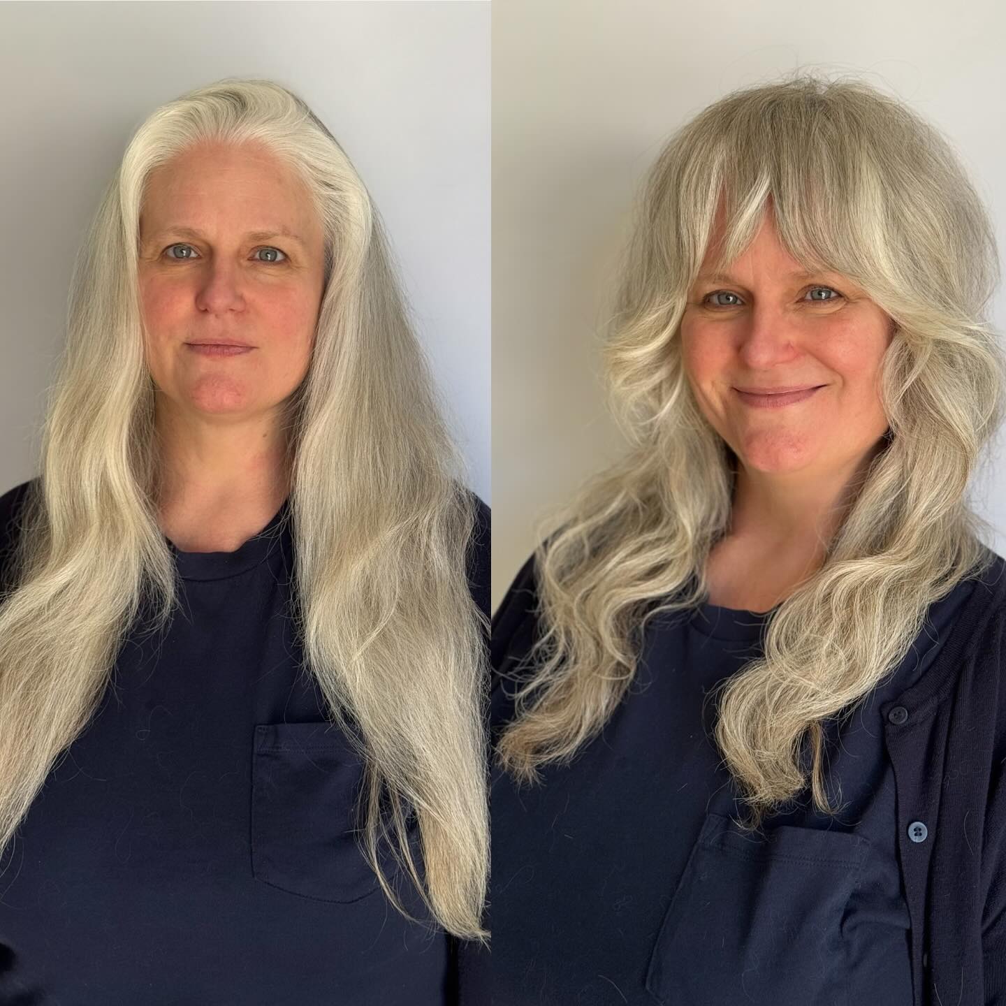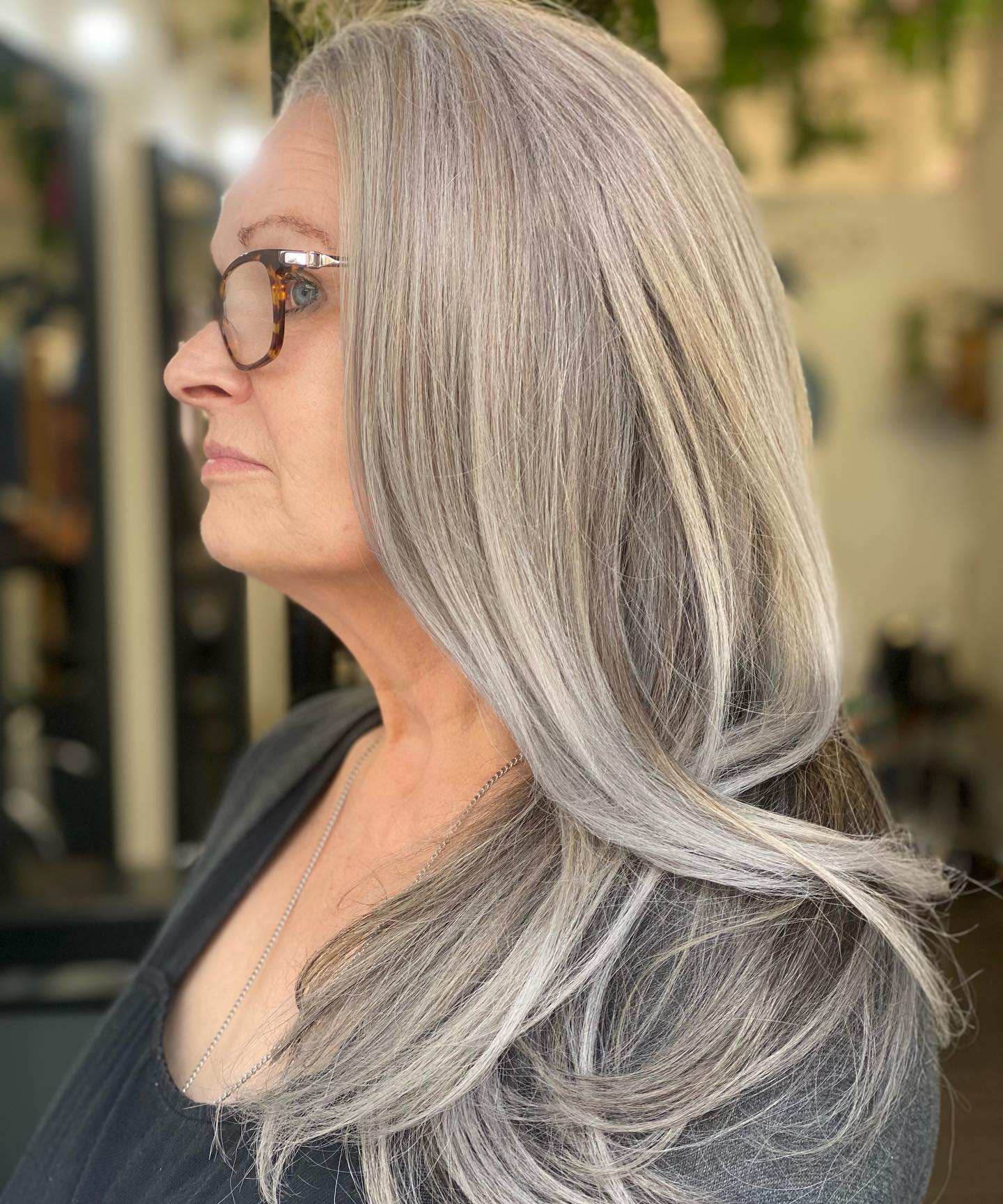 Although the ttransition from dyed hair to your natural gray can be long and expensive, this is so worth the effort! Also, the investment will pay back as a major saving on all the future color appointments that you will skip.