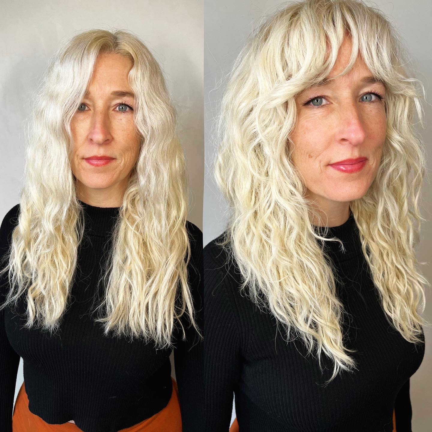 Blonde layered locks and a textured fringe always look stylish, no matter your age. Switching from regular foil highlights to a softer, more blended balayage will give your hairdo a modern vibe.