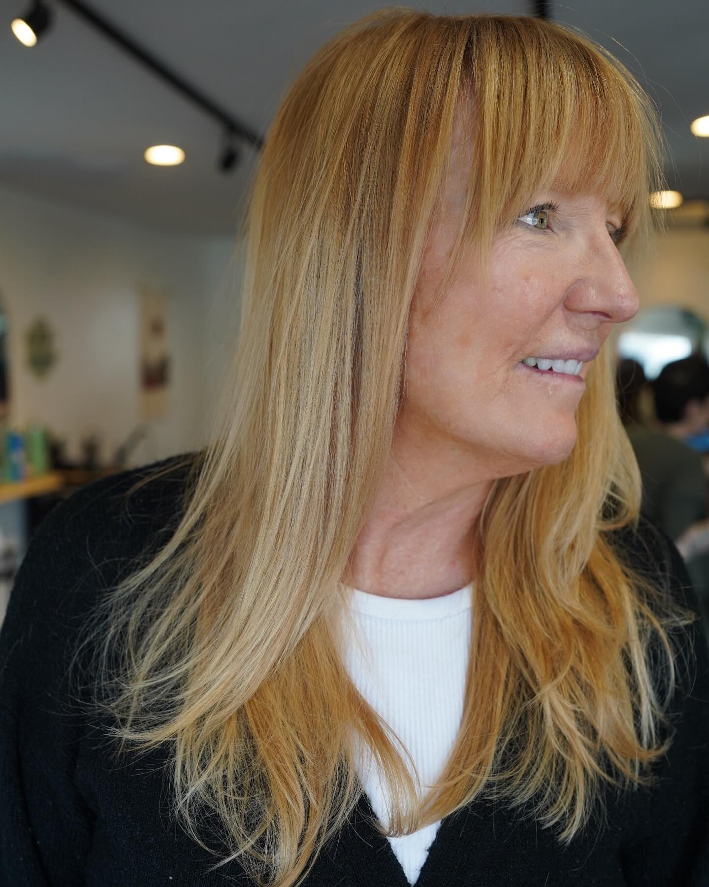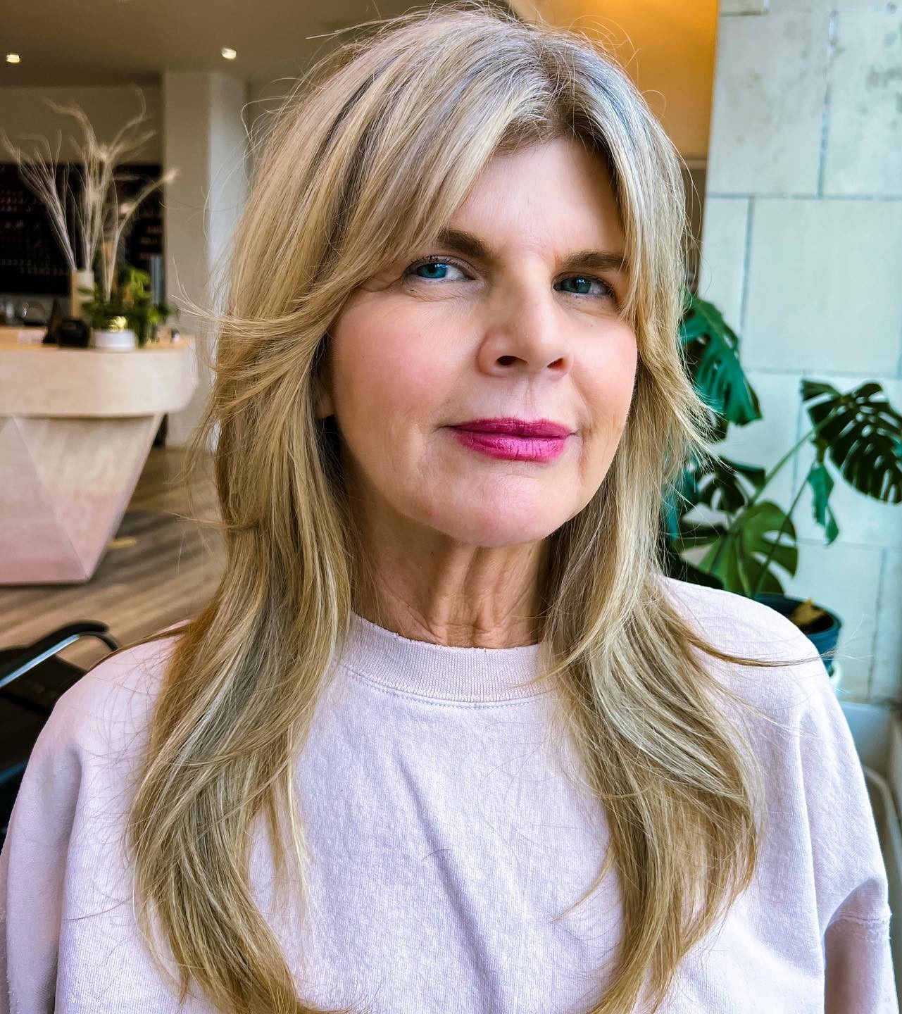 Blonde layered locks and a textured fringe always look stylish, no matter your age. Switching from regular foil highlights to a softer, more blended balayage will give your hairdo a modern vibe.