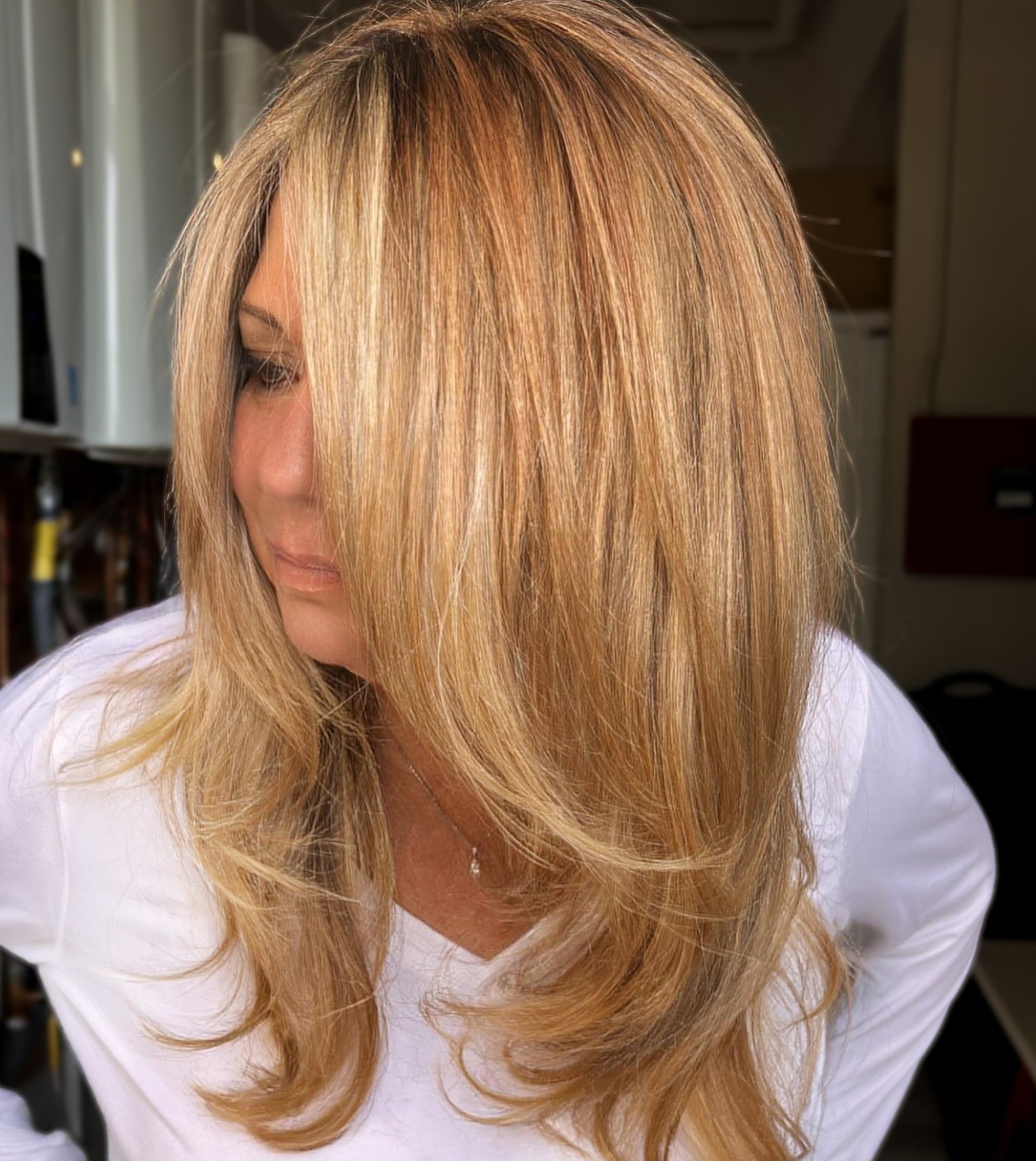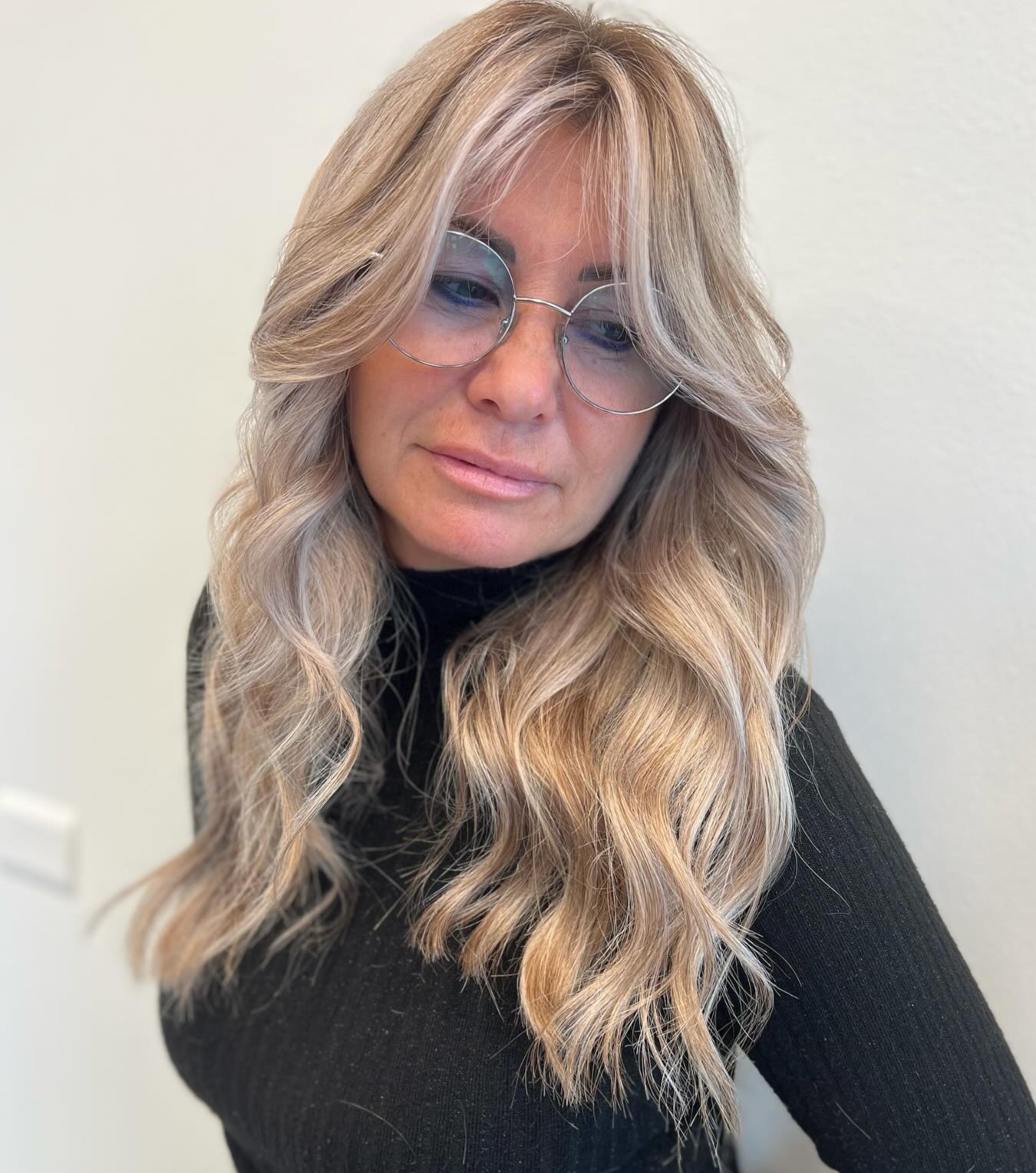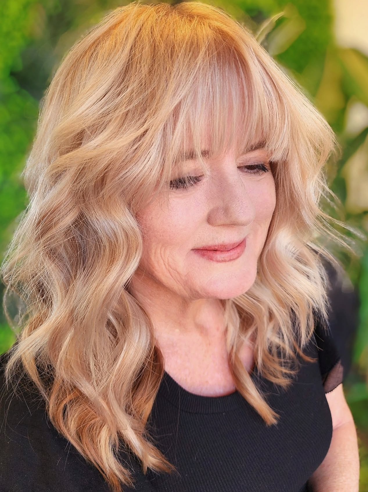 Blonde layered locks and a textured fringe always look stylish, no matter your age. Switching from regular foil highlights to a softer, more blended balayage will give your hairdo a modern vibe.
