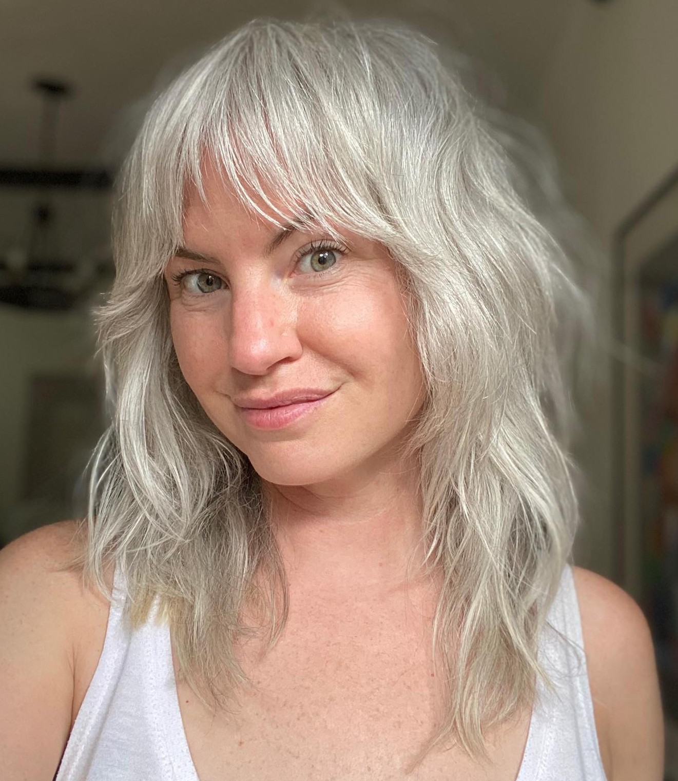 This edgy, all-over silver shag cut can be styled smooth or messy. Use some volumizing mousse and leave your hair to air dry or blow-dry it with a round brush, depending on your mood today.