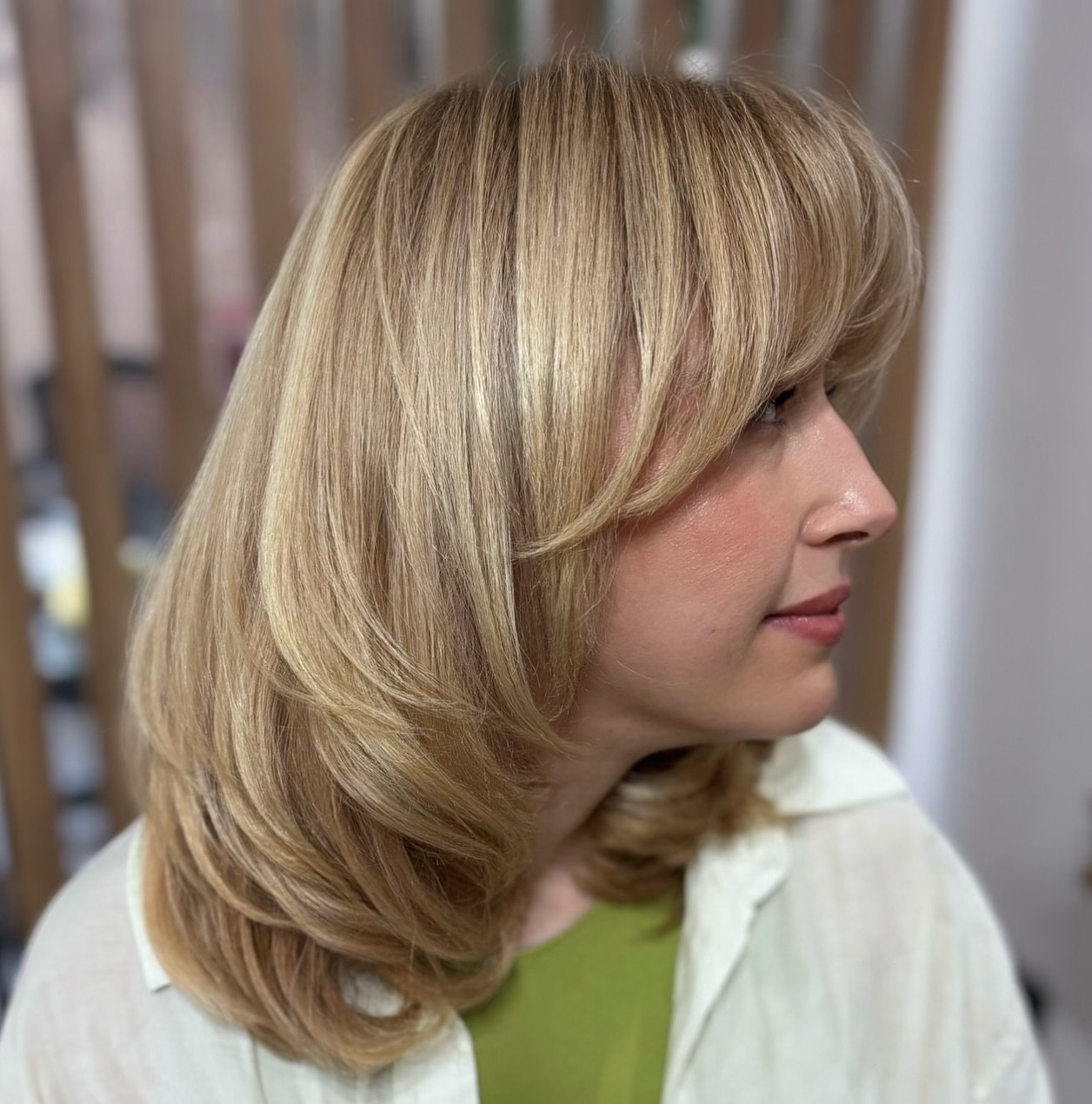 If you’re looking for a change but don’t want to sacrifice your long locks plus prefer keeping it easy-care, go for layers. They do a perfect job at creating extra volume, and face-framing fringe beautifully adds width to the longer face shape.