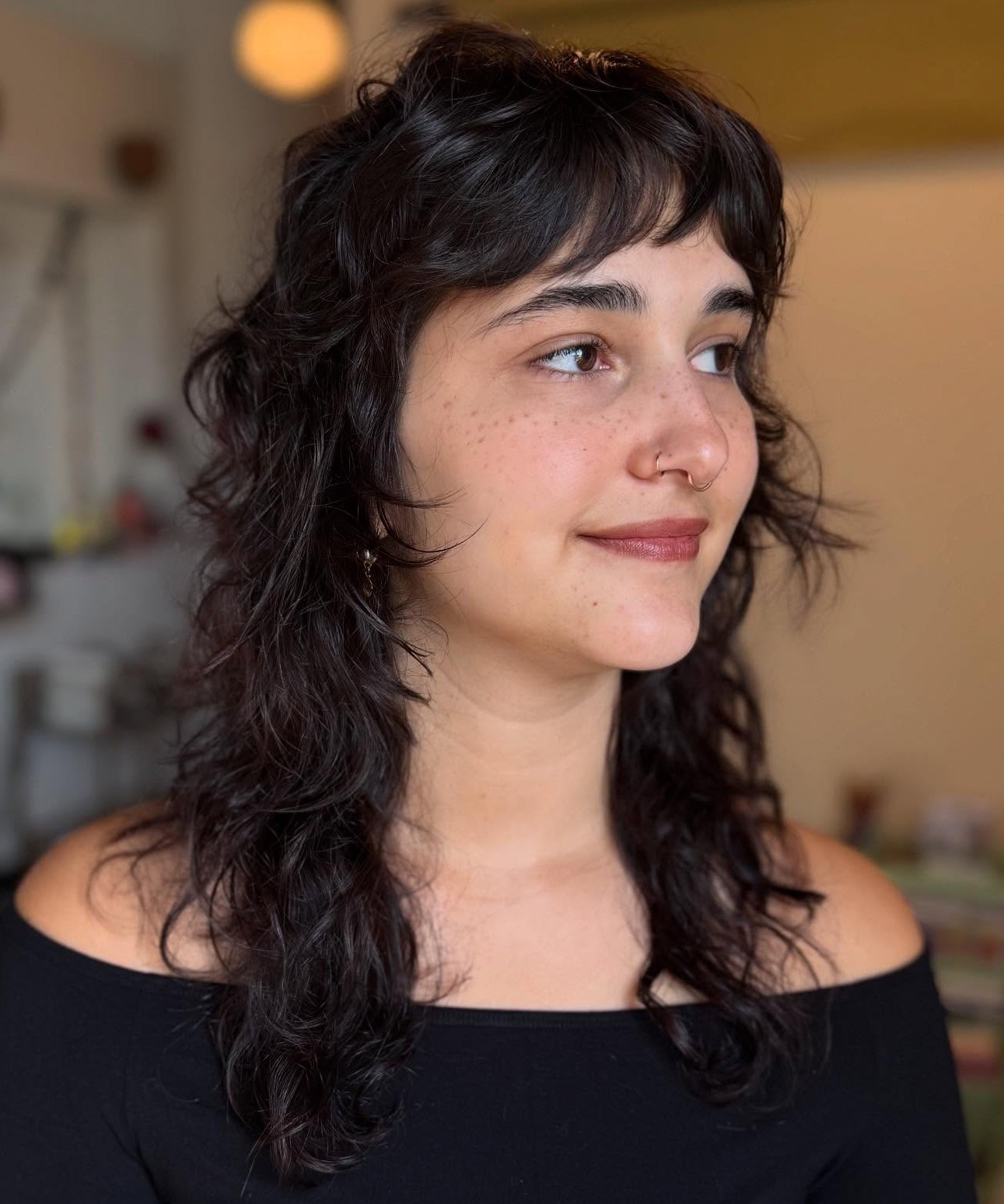 Often, curly girls don’t like their halo frizz and shy away from crown layers. A big mistake, we should say! Haircuts like a shag or a wolf cut that rely on layering near the top make adding volume to the crown a breeze and balance a curly cut perfectly.