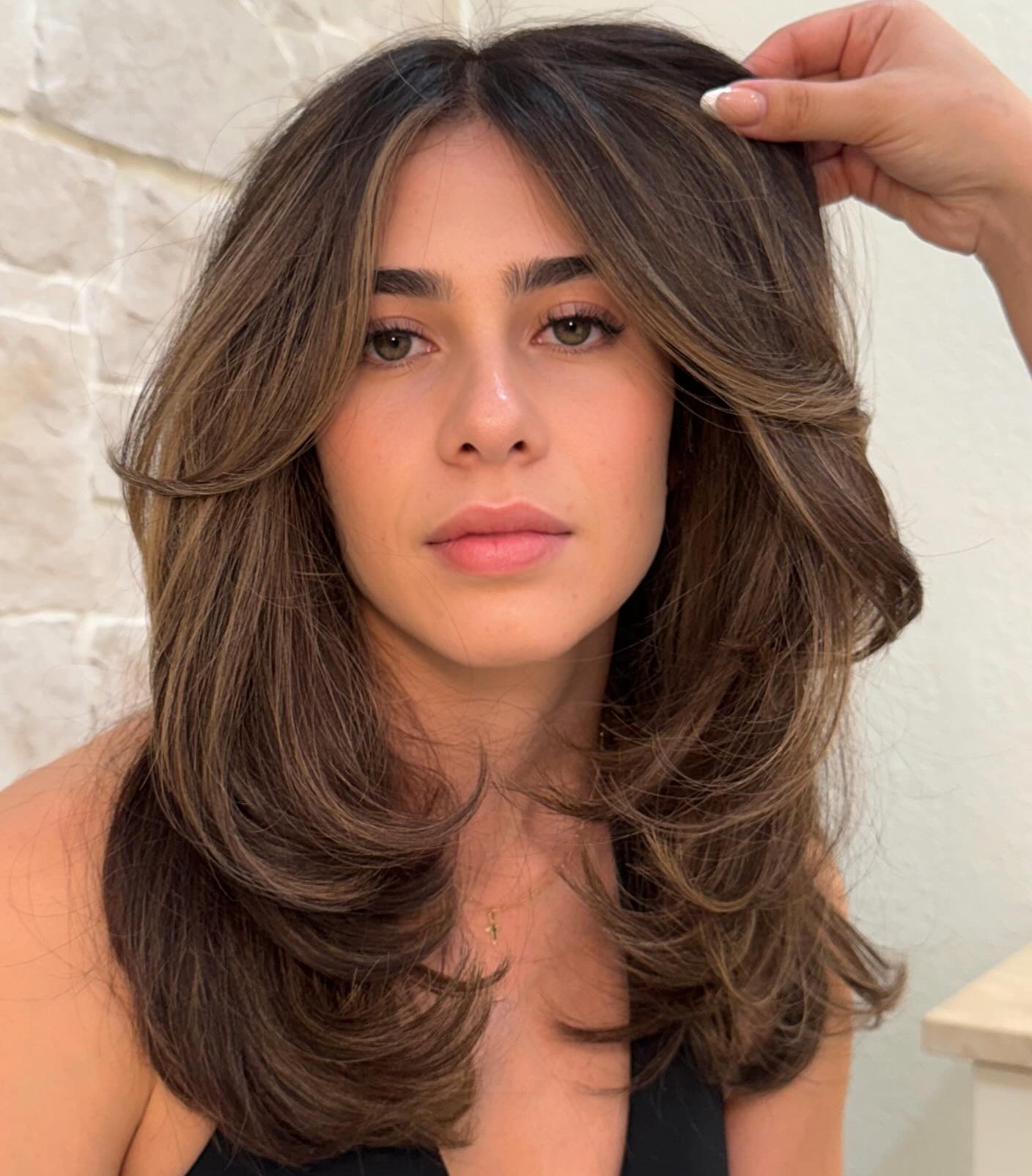 If you’re looking for a change but don’t want to sacrifice your long locks plus prefer keeping it easy-care, go for layers. They do a perfect job at creating extra volume, and face-framing fringe beautifully adds width to the longer face shape.