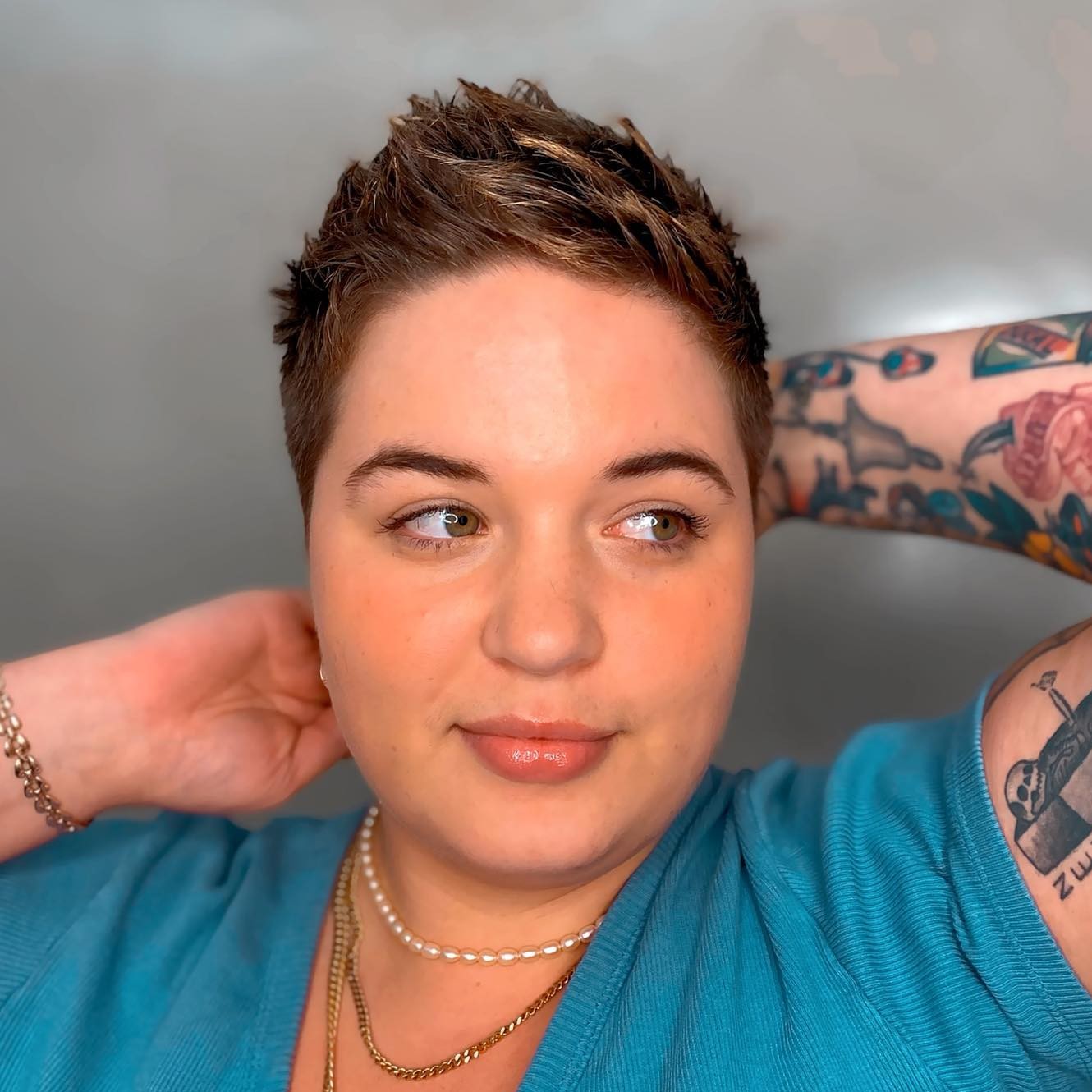 Soft feathering and long side bangs make this pixie bob flattering for the round face shape. Face-framing highlights make a huge statement, while a white blonde hue does a perfect job of blending the first gray hairs.