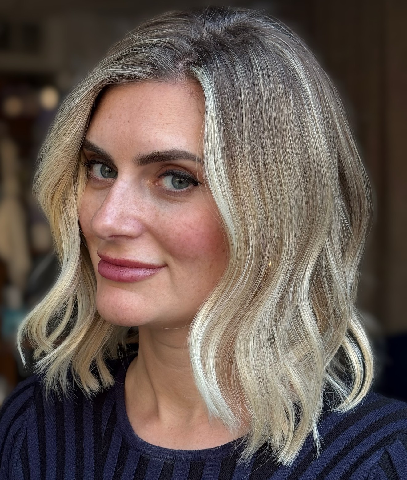 Who knew low-maintenance haircuts could look so edgy while being simple to style? This messy blonde bob features half-done waves and an off-center part.
